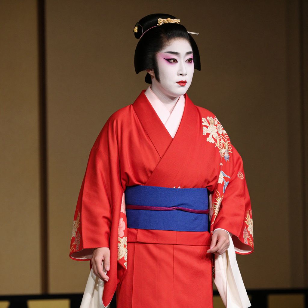 Kabuki opera costume, dressed in a kimono with a red sash and a blue belt