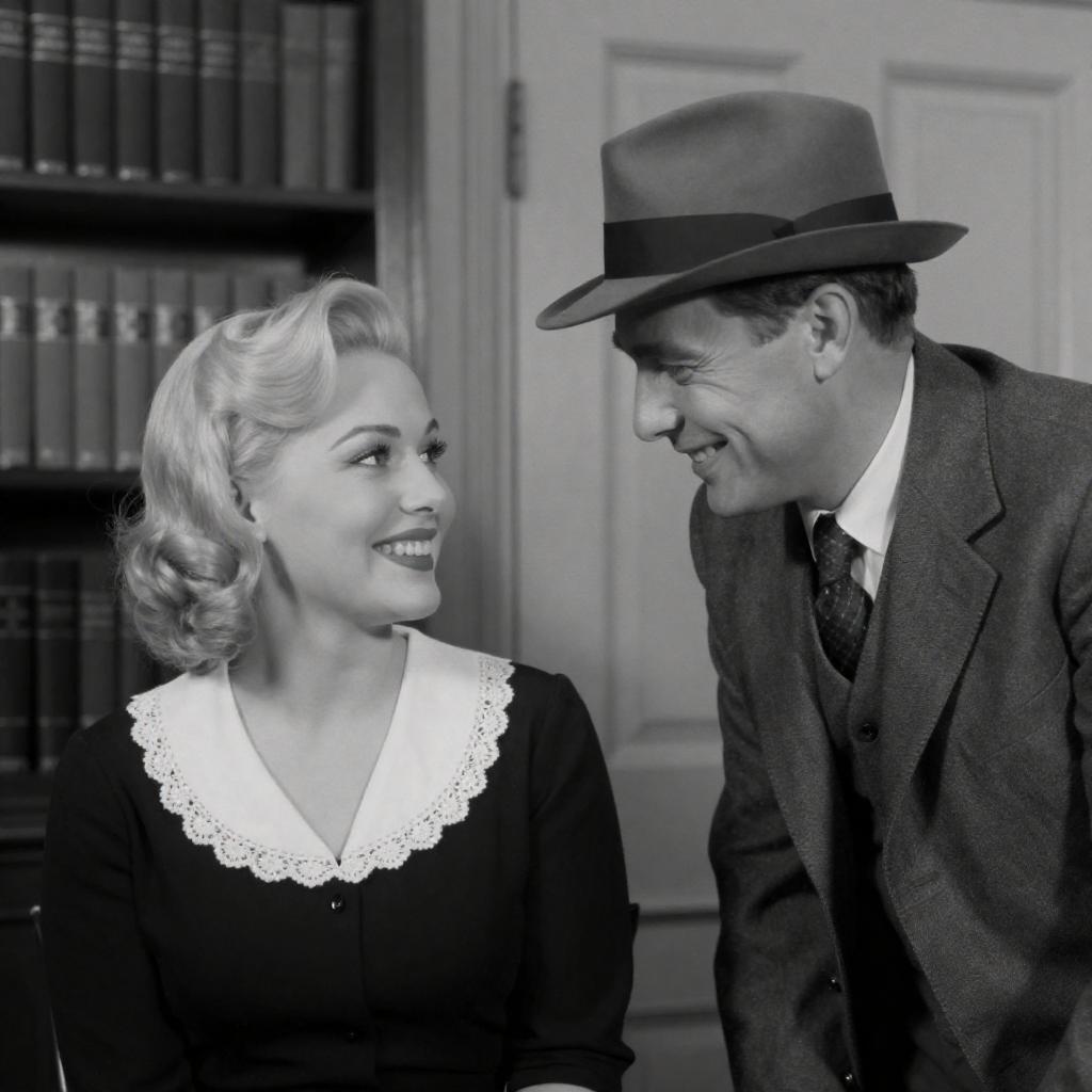 Black-and-white photograph of four people in vintage clothing. Center: blonde woman with medium breasts in a sleeveless dress, left: man in patterned suit, right: man in dark suit and hat, far right: man in loose coat and hat. Background: elegant room with furniture. Man in center raises arm, others gaze at her.
