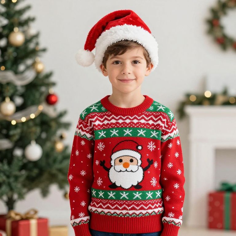 Xmas Fancy Dress Outfit, boy in a red and green christmas sweater and hat