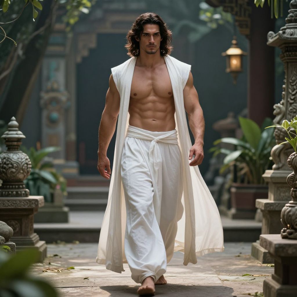In a breathtakingly detailed and hyper-realistic scene, a muscular man exudes regal elegance as he strides through a temple garden bathed in natural light. His long white loincloth, adorned with intricate patterns, flows gracefully, contrasting with his tanned, well-defined physique. The man's hooded attire adds an air of mystery and sophistication, while the lush greenery and delicate white flowers in the background create a serene and enchanting atmosphere. The dramatic lighting, enhanced by the use of the Unreal Engine, casts dramatic shadows and highlights the textures of his clothing and the surrounding foliage, creating a cinematic and epic fantasy romance ambiance. The overall composition is masterfully crafted, with the man positioned centrally, drawing the viewer's eye through the scene and inviting them to explore the intricate details of this fantastical world.