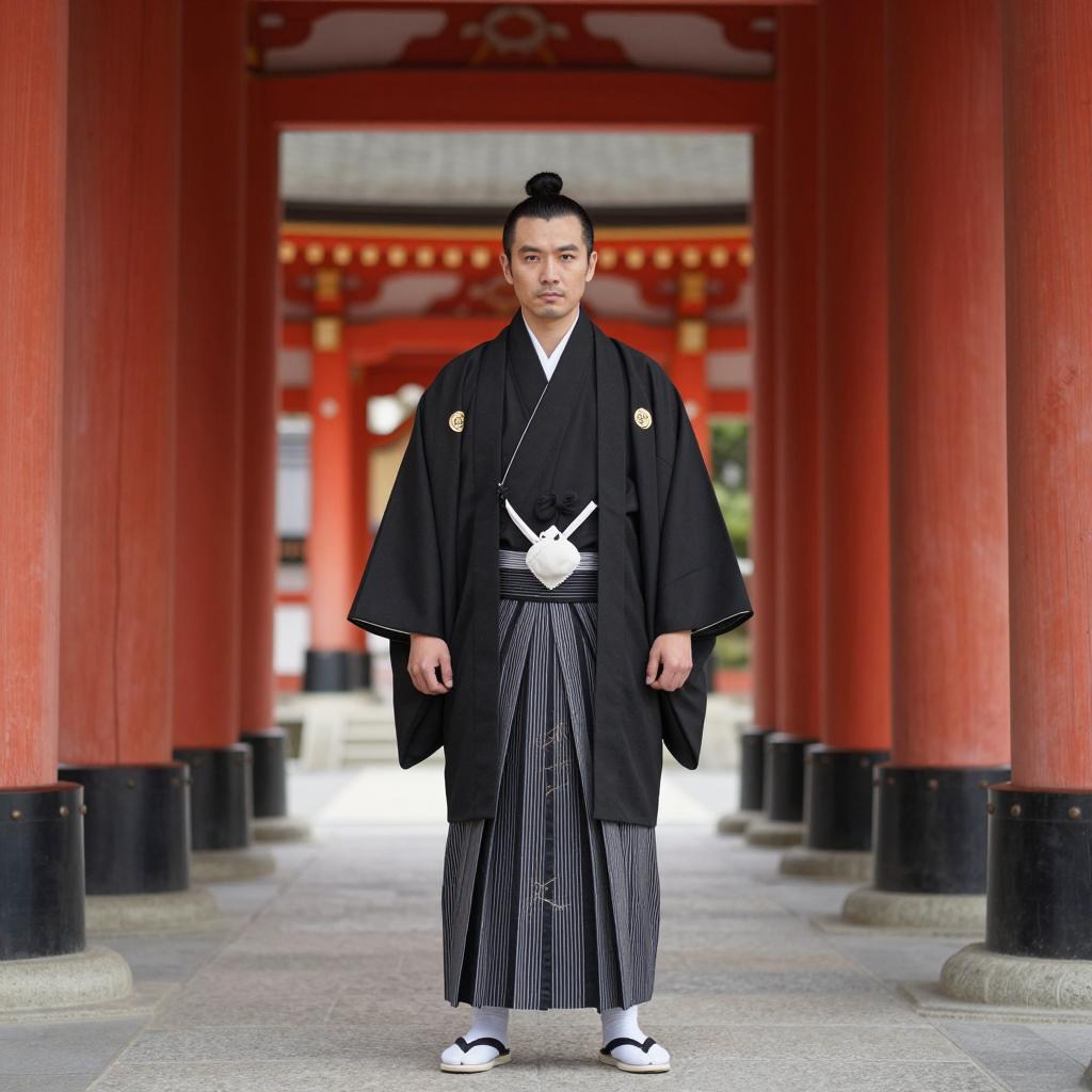 Japanese man fashion costume, photo of Asian man standing in traditional Japanese temple hallway, wearing black kimono with gold embroidered patches, top bun hairstyle, serious expression, red wooden columns in background, stone pathway, traditional Japanese architecture, natural light, centered in frame, detailed ures on kimono, slightly blurred background, realistic style, calm atmosphere, symmetrical composition