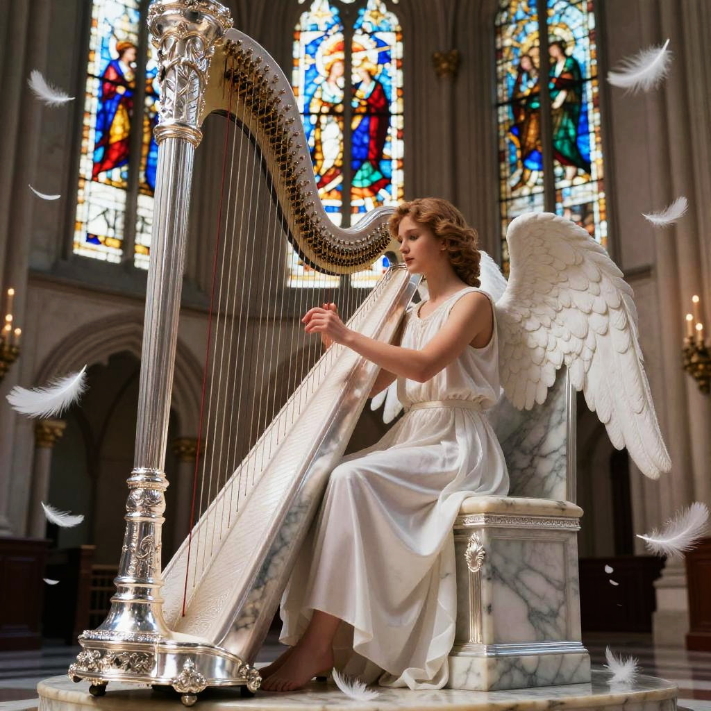 Blonde Greek muse playing a lyre in a blooming olive grove, gentle breeze, white marble statues around, pastel sunset sky, ethereal and dreamy composition