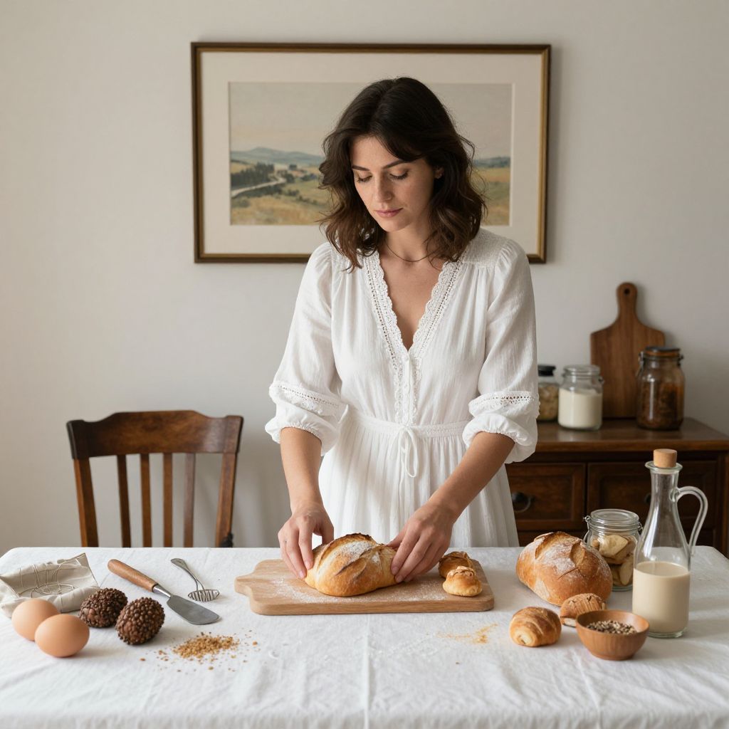 Woman in a white dress stands at a table, arranging freshly baked bread and pastries, with a rustic kitchen setting featuring a wooden chair, framed artwork above, and various baking tools and ingredients neatly organized around her.