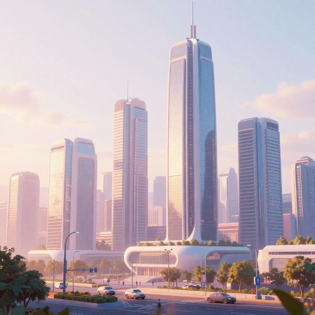 Pastel:af9ji_y9zpm= futuristic cityscape at dawn rendered in pastel palette, sleek architecture with curved lines, subtle reflections on glass surfaces, haze of warm pastel tones creating a harmonious and peaceful urban atmosphere