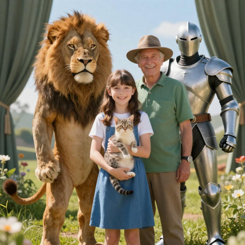 Photograph of four characters: lion-man, girl in blue dress with cat, older man in green, and metallic man in armor. Lion-man stands left, girl in center holding cat, older man behind girl, metallic man right. Green curtains, bright sky background. Lion-man with fur, girl smiling, older man smiling, metallic man smiling. Grass and flowers in foreground. Lion-man's tail visible. Older man wearing hat and green shirt. Girl in blue dress, white shirt. Metallic man in silver armor. Bright sunlight.