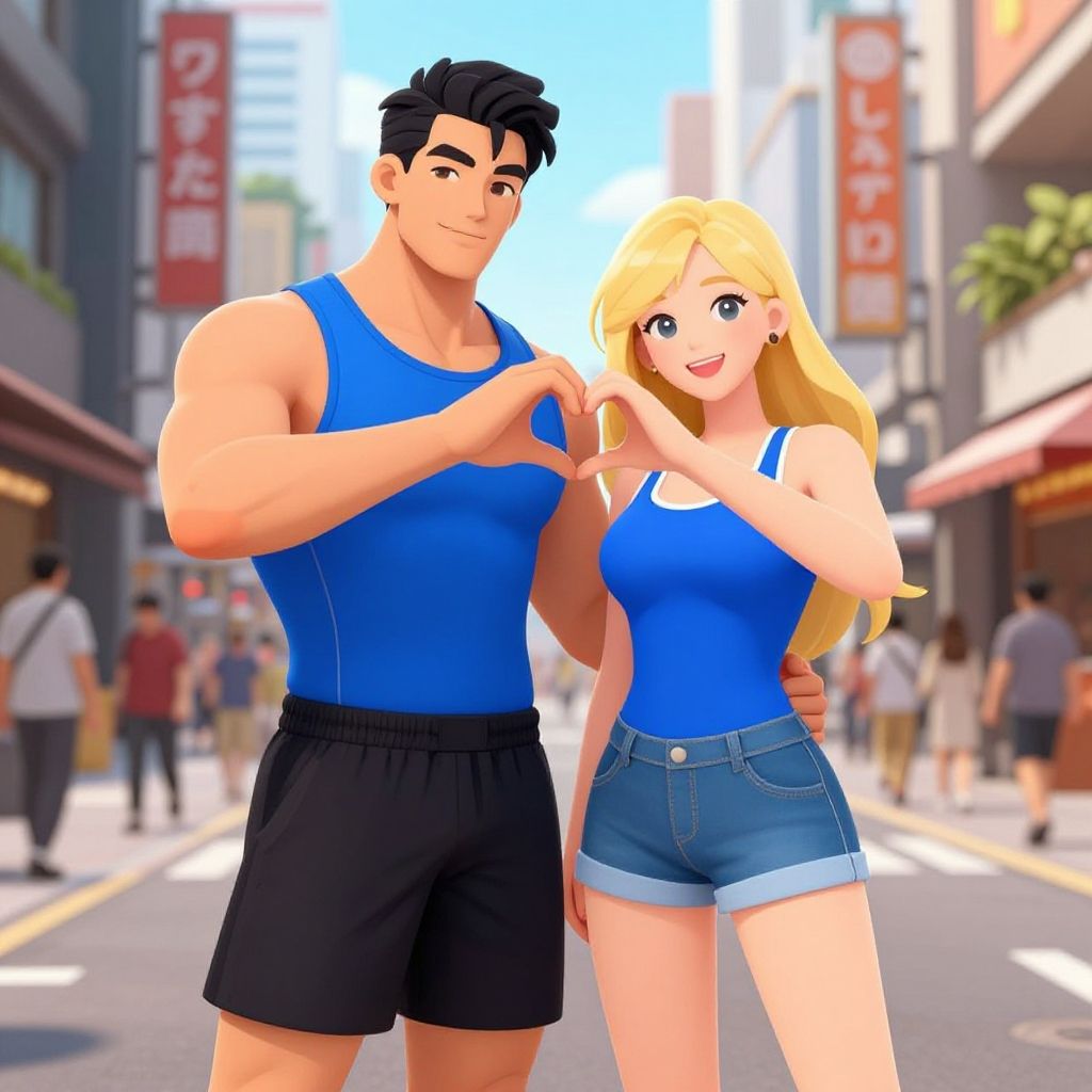 Anime-style illustration of a muscular man and a blonde woman making heart shapes with their hands while standing in a bustling urban street. Both are wearing blue athletic tops, with the man in a sports bra and black shorts, and the woman in a camisole and denim shorts. The background features tall buildings and various shop signs, giving a lively city atmosphere.