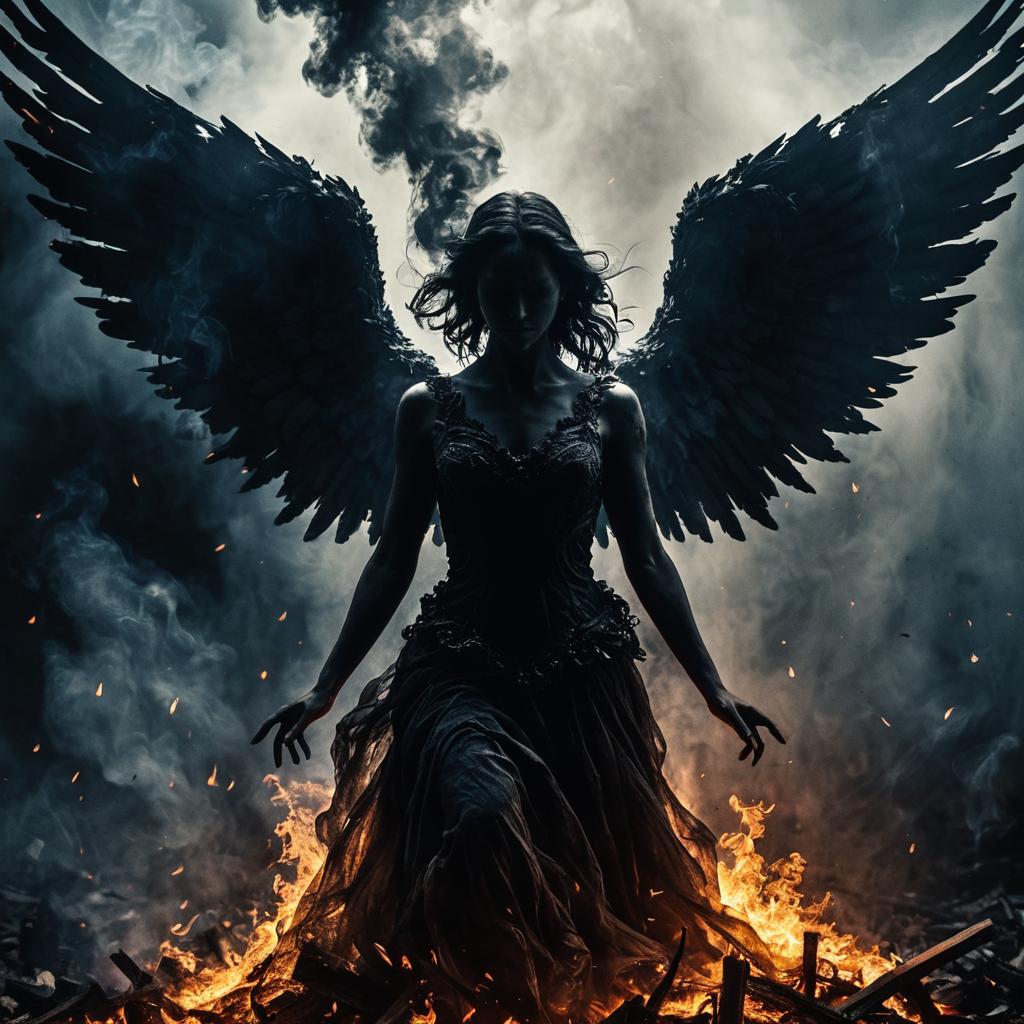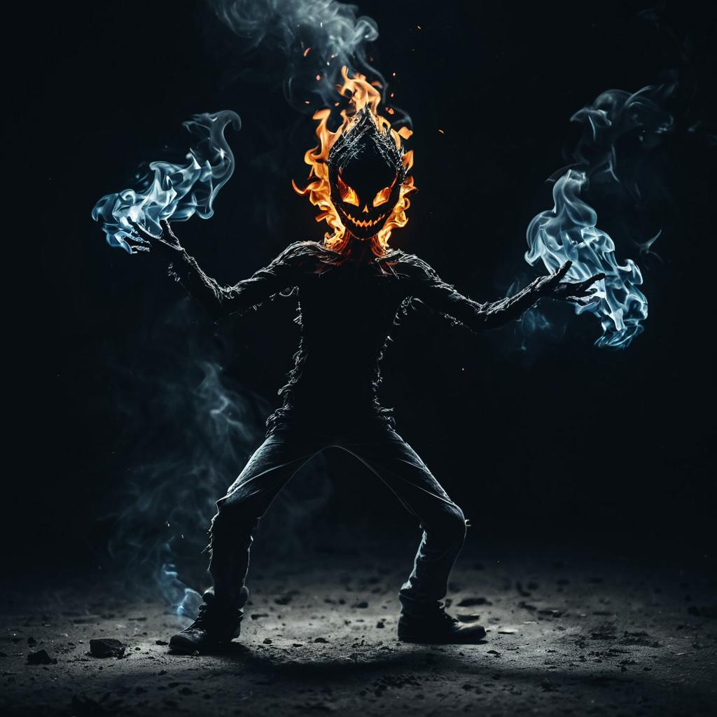 Abstract depiction of a supernatural sprite made of dark flame, smoke, and heat. The figure has a glowing, menacing face with sharp eyes and a wide grin. Flames engulf its head while smoke wisps emanate from its outstretched hands. Set against a dark background, the sprite appears ethereal and powerful, embodying magical realism with an intense, cinematic atmosphere.