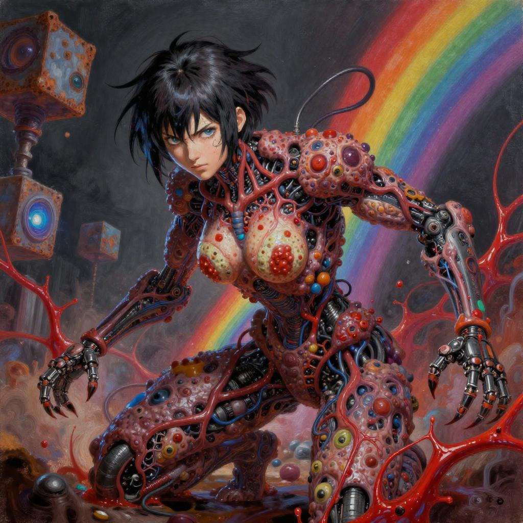 A cybermutant flesh mutant made of pulsating flesh and biomechanical limbs, hyper mutant girl, fusion of flesh and machine, quivering tumors, fleshy growths, mutagenic, cybernetic hoses, wires, anime style, 2d, fighting game style masterpiece, best quality, ultra realistic, 32k, RAW photo, detail skin, 8k uhd, dslr, high quality, film grain, \nShort and messy hair, dynamic, vibrant, action-packed, detailed character design, reminiscent of fighting video games, black bloody veins growing and intertwining out of the darkness, oozing thick neon rainbow blood, veins growing and pumping blood, vascular networks growing, connecting, expanding, red veins everywhere, zdzislaw beksinski, (vibrant colors:1.1), (Infrared:1.2), Rust, Hypercube, ultra detailed, intricate, oil on canvas, ((dry brush, ultra sharp)), (surrealism:1.1), (disturbing:1.1), beksinski style painting, sparks, lens flare, rim lighting, backlighting, RTX, Post Processing, satanic cross, man body, muscular, venom costume, (japanese portal), death shadow nightmare ethereal beast, floating into the abyssal heights, nebula, cinematic, dreaming, Film light, bathing in light, very sharp focus, Hyper detailed, Hyper realistic, masterpiece, spiritual, surreal, atmospheric, maroon cream bronze, High resolution, Vibrant, High contrast, dark angle, 8k, HDR, 500px, dystopian