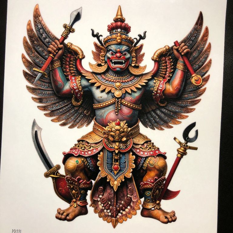 "Conductor garuda, indonesian god standing with weapons in arms, hyper realistic, fierce, color, hyper realistic, world class tattoo, Magazine quality, vibrant, modern,"
