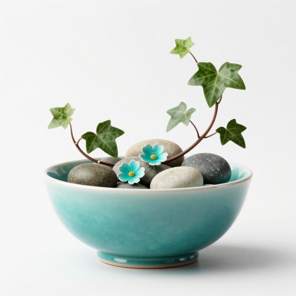 A contemporary still-life of a translucent teal porcelain bowl, filled with curvilinear ivy vines, smooth river stones, and small turquoise flowers. Executed in high-end 3D render with bold shapes, crisp edges, matte–gloss contrast, and careful negative space. Clean white gallery backdrop, vivid blues and greens, high contrast, subtle paper grain, refined lighting, serene mood, editorial quality.