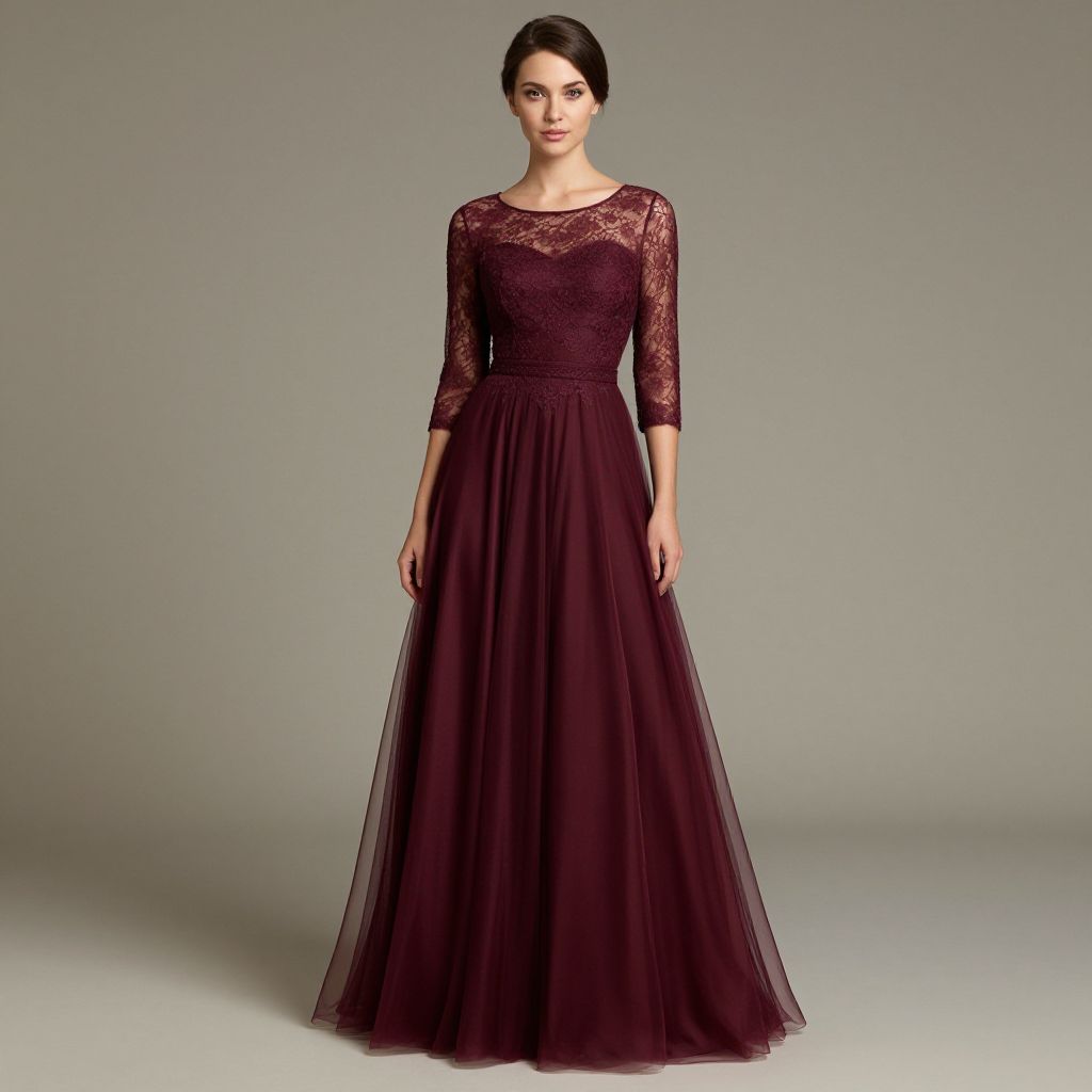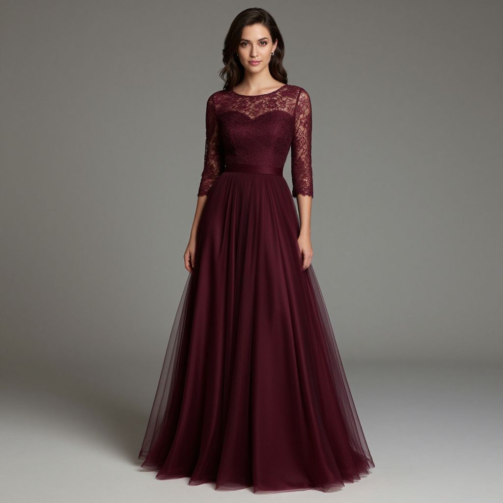 Elegant woman wearing a wine-red A-line evening dress featuring lace detailing, three-quarter sleeves, and a flowing tulle skirt, exuding sophistication against a neutral backdrop.