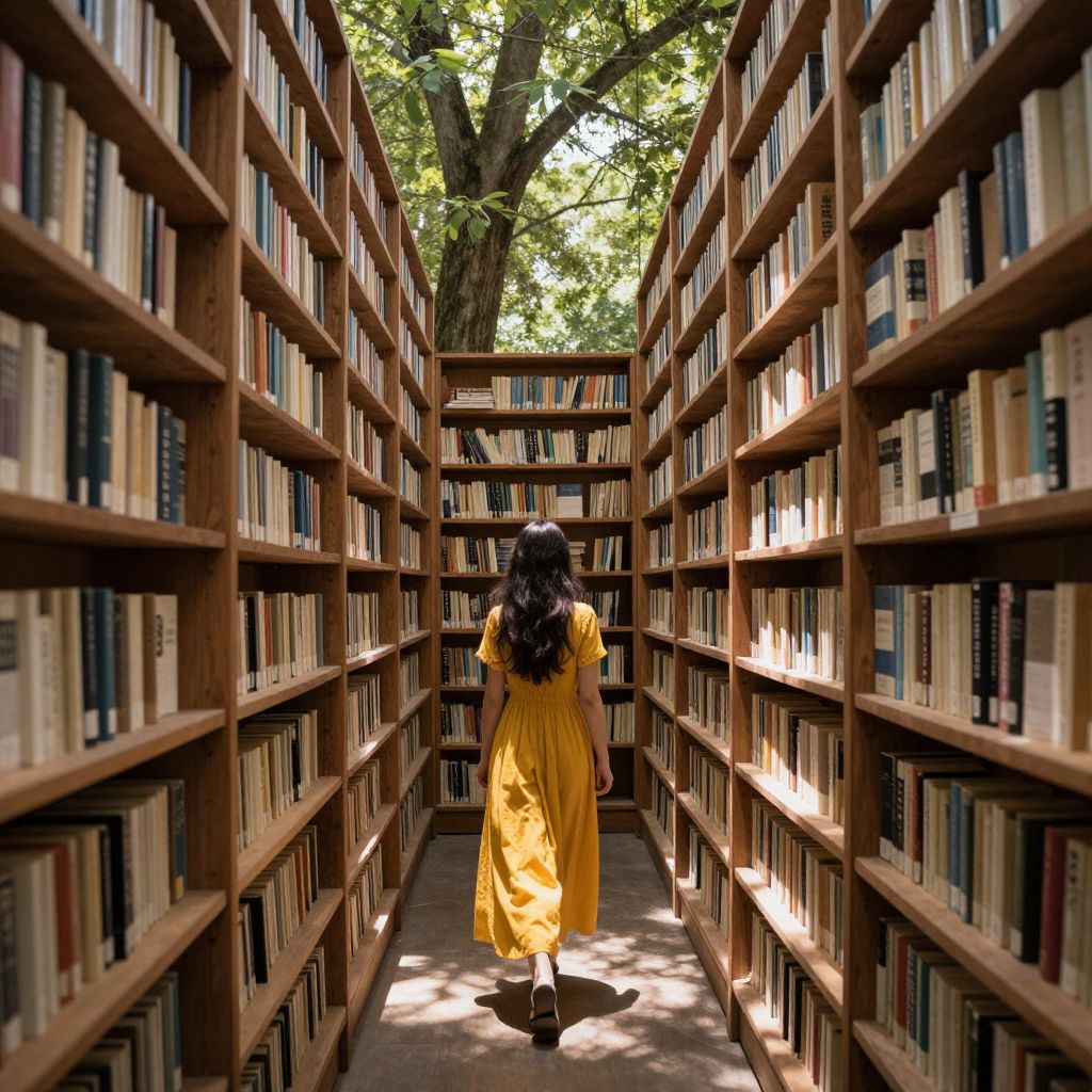 Books line towering wooden shelves that stretch into a sunlit forest, where a woman in a flowing yellow dress walks away, surrounded by dappled light and nature intertwining with knowledge.