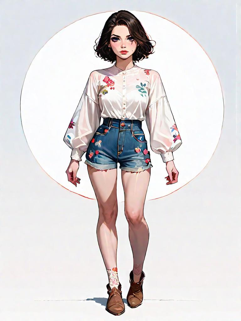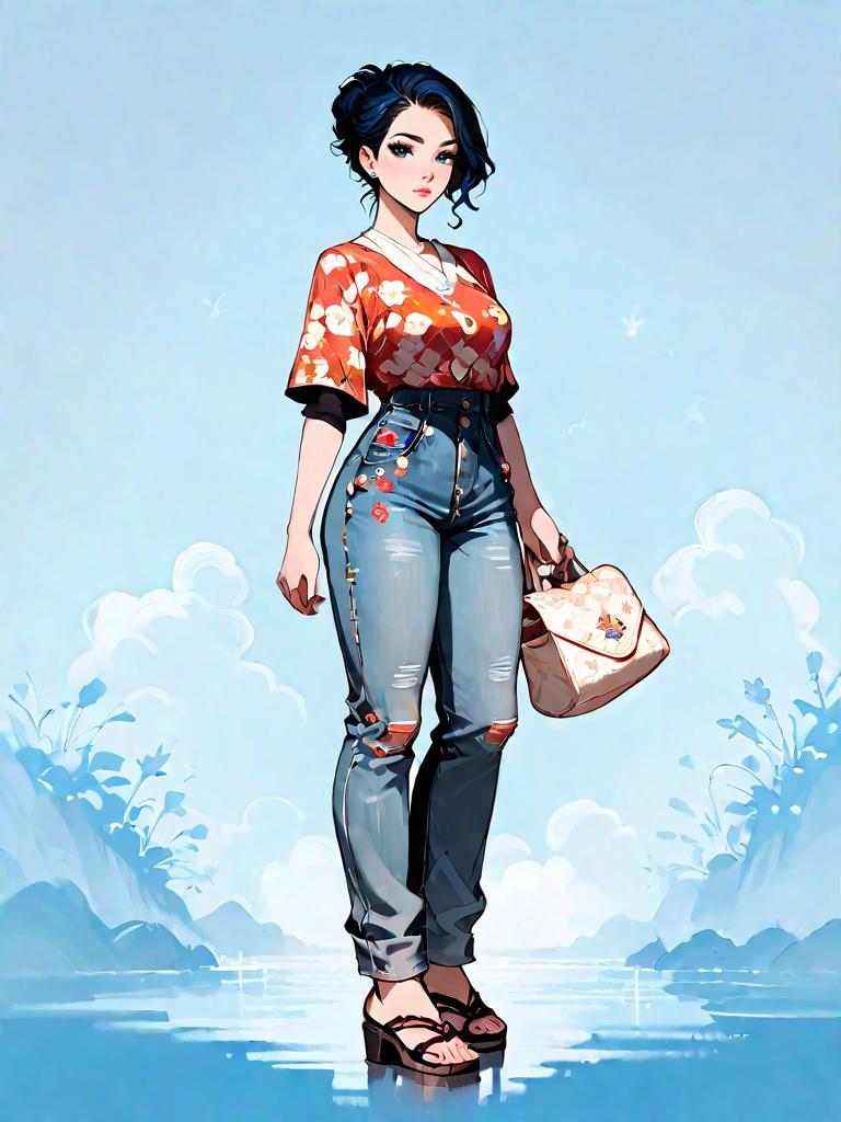 1girl, source_comics, realistic face, full body shot, Woman, casual, loose-fitting white blouse with horizontal black stripes, V-neckline, long sleeves, tucked into blue skinny jeans, dark shoulder bag with chain strap.