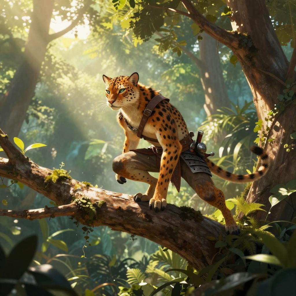 Digital artwork of a Tabaxi, a humanoid feline character with spotted fur and bright green eyes, crouched on a tree branch in a dense jungle. The Tabaxi wears lightweight leather armor with metal accents and has a small sword sheathed at the waist. Sun rays penetrate the lush foliage, highlighting the vibrant and natural jungle environment. The scene portrays agility and readiness, emphasizing the character as a skilled hunter in a fantasy setting.