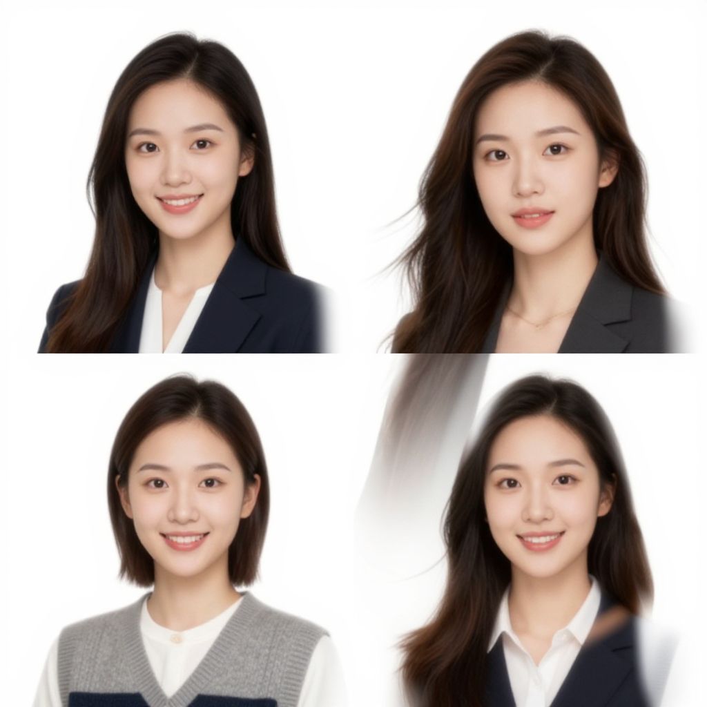 Photograph of an East Asian woman with fair skin and long, dark brown hair, shown in four different headshots arranged in a 2x2 grid. She wears a black blazer over a white shirt in the top left, top right, and bottom right images, and a gray, knitted vest over a white shirt in the bottom left image. Her expressions are friendly and professional, with a slight smile in all images. The background is plain white, highlighting her facial features and attire. The lighting is even, emphasizing her smooth skin and natural makeup.
