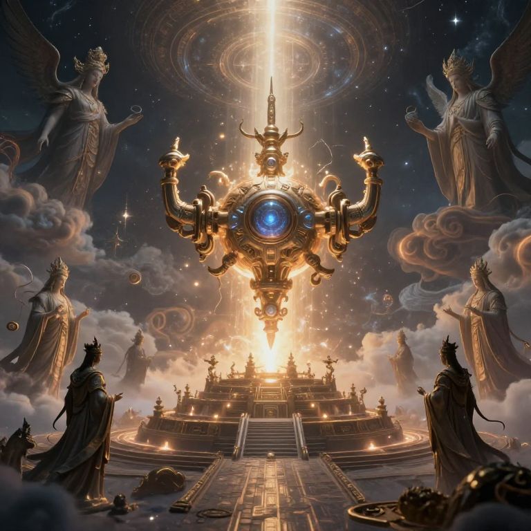Mysterious gods generator on a celestial battlefield, ancient mechanical artifact radiating divine light, surrounded by swirling clouds and mystical beings, intricate ornaments blending mythology and advanced technology, dramatic lighting with a mythic tone.