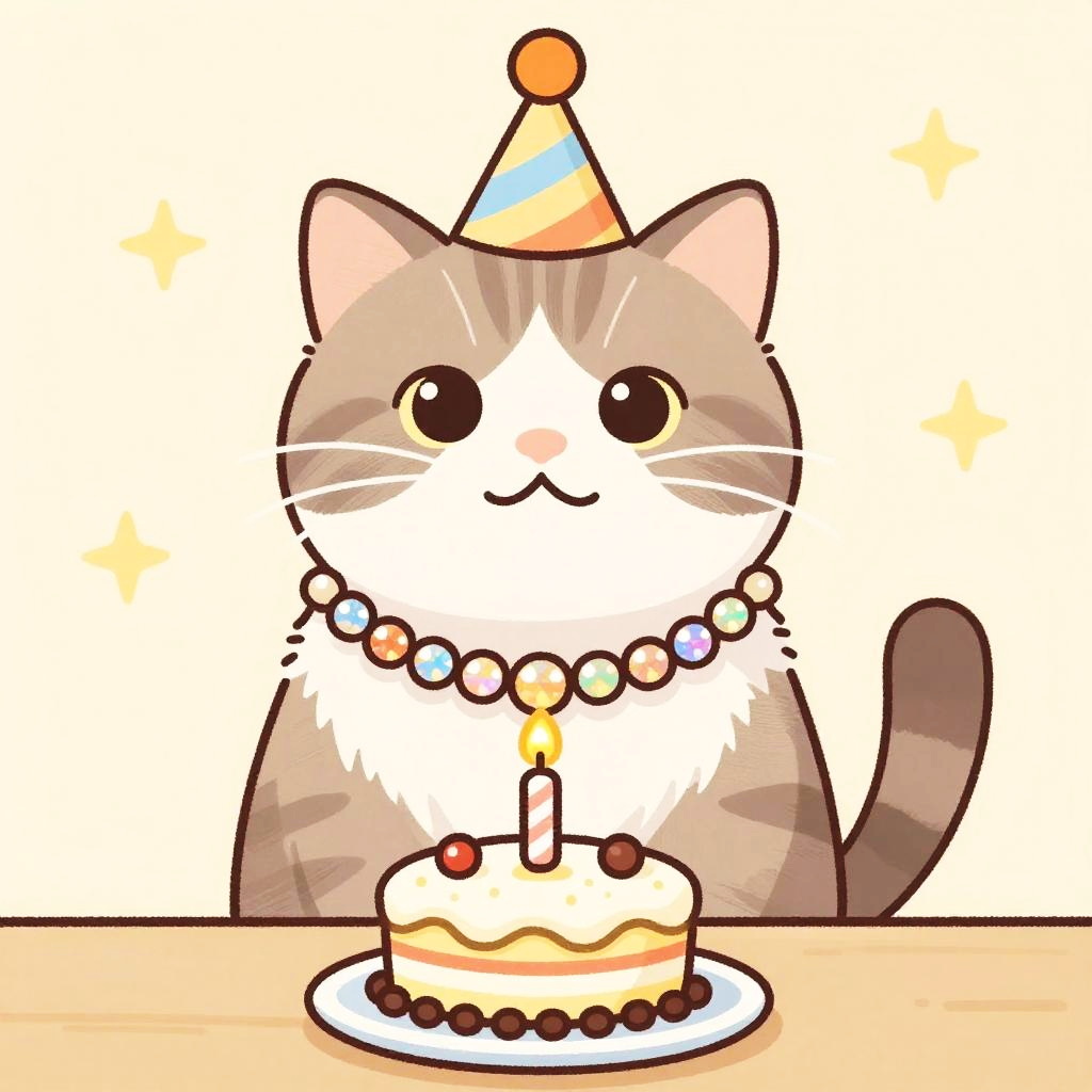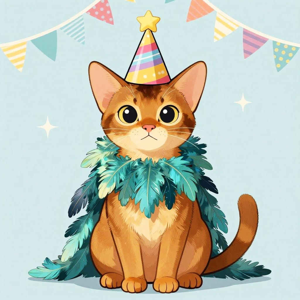 Furry anthropomorphic Abyssinian cat wearing a feather boa celebrating a birthday, cartoon style