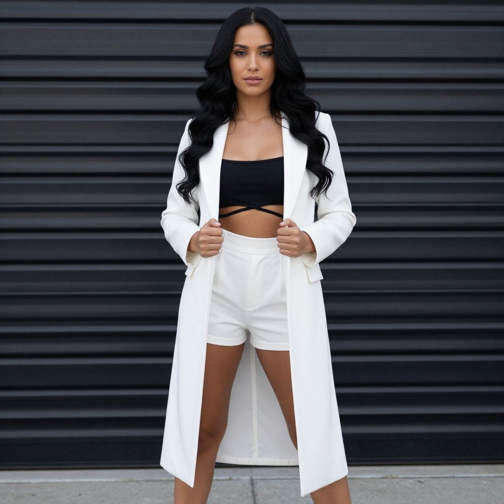 Photograph of a woman with long, wavy black hair standing against a dark, horizontal-striped background. She's wearing a white, long-tailed blazer over a black crop top that reveals her midriff with a black strappy design, and high-waisted white shorts. Her hands are gripping the blazer's lapels. She has a medium-brown skin tone and a slender build. The concrete ground is visible at the bottom.