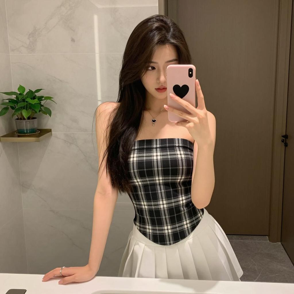 Woman with long dark brown hair, white ribbed crop top, white pleated skirt, standing in profile, taking a mirror selfie. She holds a smartphone in her right hand. She stands in a minimalistic room with a white bed and white walls. The bed has a crumpled white sheet. Her facial expression is neutral. The image is a photograph.