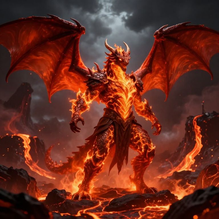 Fantasy hero art of a powerful half-dragon warrior with fiery scales and wings unfurled, standing in a volcanic landscape amidst molten lava flows, intense and heroic stance, dark ominous clouds above, and dramatic contrast lighting.