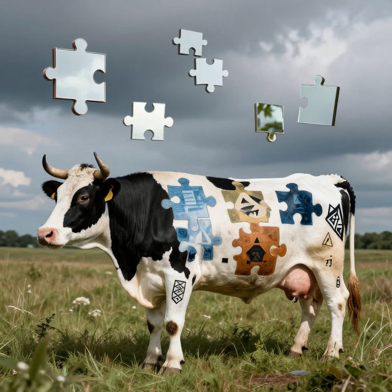 Photograph of a black-and-white Holstein cow standing in a grassy field under a cloudy sky. The cow has various puzzle pieces floating above its body, some containing images like a tree and a blue square. The cow's body features additional puzzle pieces with symbols like a house and a geometric shape. The image blends realistic photography with digital elements, creating a surreal, thought-provoking visual. The cow's horns are black, and its eyes are brown, with a yellow ear tag visible. The grass is green with small white wildflowers.