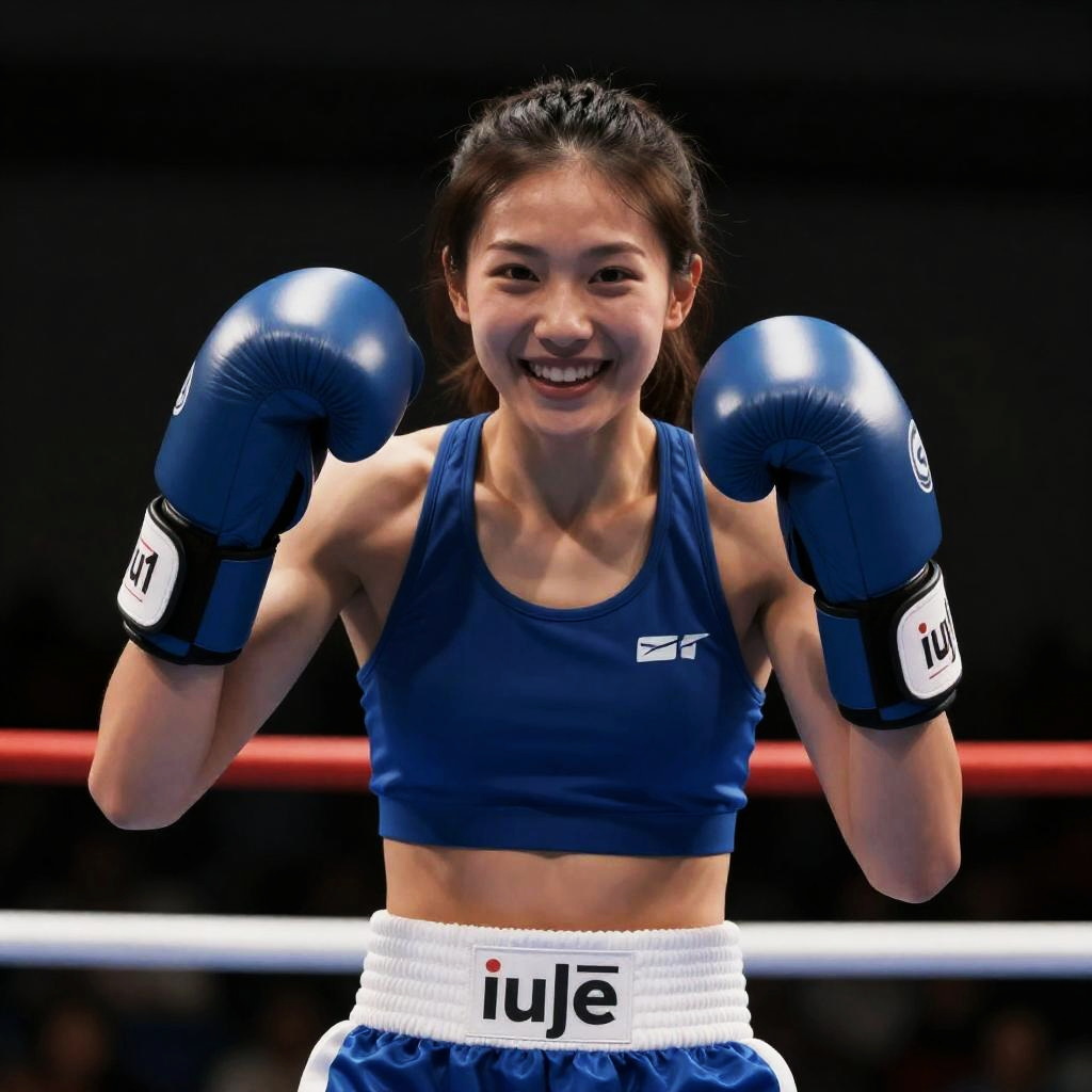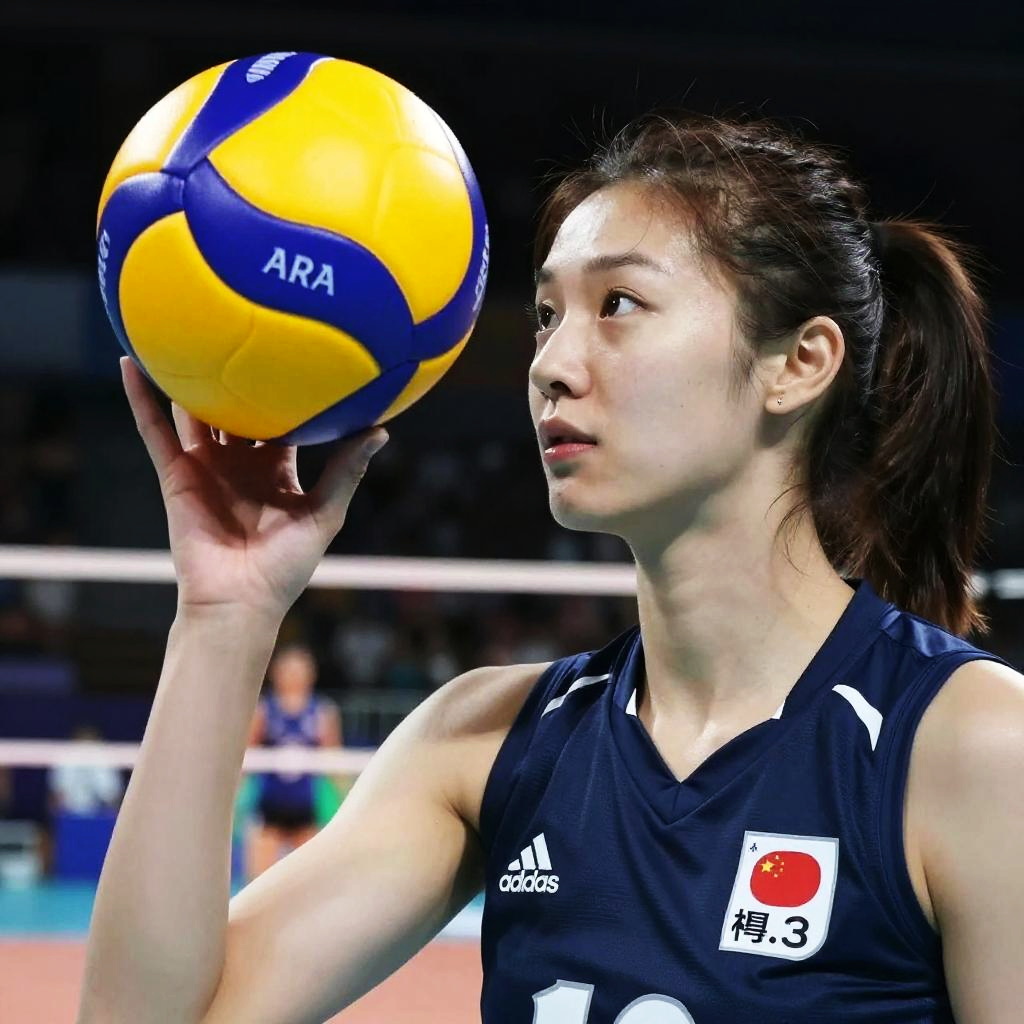 Portrait of an Asian female volleyball player wearing a navy blue Adidas jersey holding a yellow and blue volleyball. The player is focused, preparing for a serve or play, inside an indoor volleyball court with a net visible in the background. The lighting is soft and cinematic, highlighting her facial features and athletic posture.