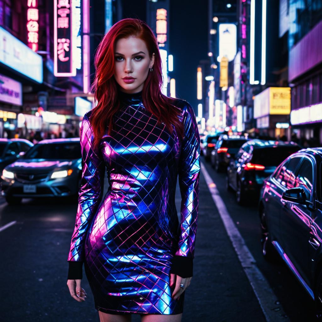 Cyberpunk dress, photorealistic, red-haired woman, standing on city street, nighttime, wearing tight, metallic, iridescent, long-sleeve dress with geometric patterns, purple, pink, blue, black colors, serious expression, urban background, neon lights, blurred cars, modern cityscape, realistic lighting, cinematic style, high contrast, detailed ures, fashion-focused, street fashion, trendy, city life, confident pose, natural light from neon signs
