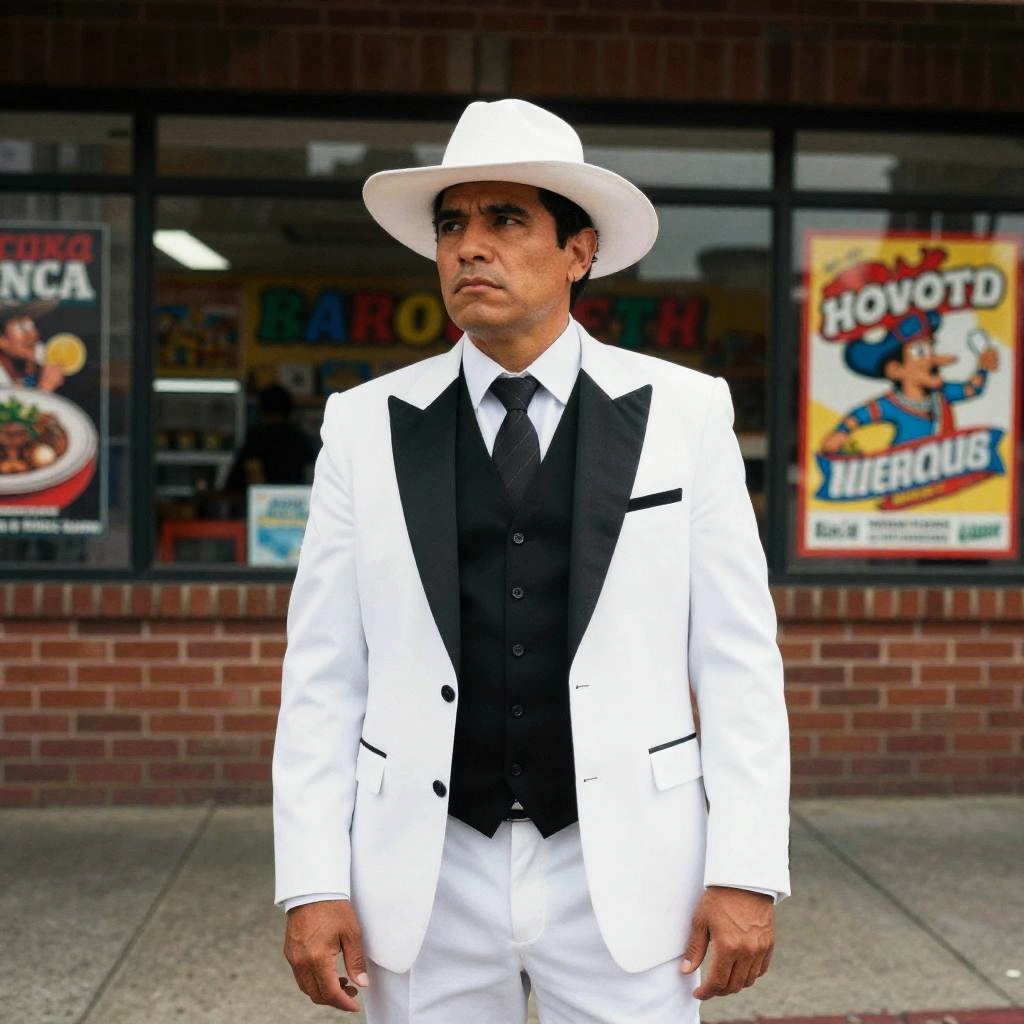 Photograph of a man standing in front of a Mexican restaurant. He's wearing a white suit with a black vest and tie, and a white hat. He's looking slightly to his left, with a serious expression. The background shows a brick building with large windows and colorful posters. The ground is gray concrete. The image has a slightly grainy, high-contrast filter.