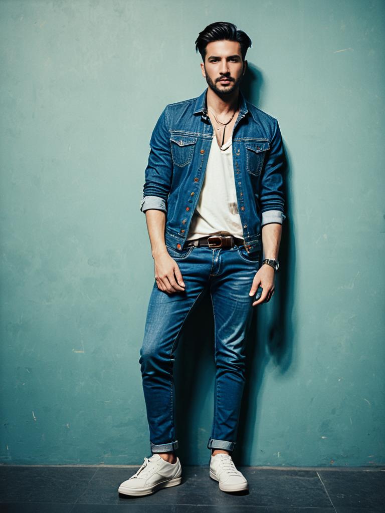 Full-length portrait of a young man wearing a casual stylish outfit consisting of a denim jacket, denim jeans, a white t-shirt, and white sneakers, posed against a plain blue-gray wall. The man has dark hair styled back, a neatly trimmed beard, and accessorizes with a wristwatch and layered necklaces. The photo showcases a contemporary fashion look with a cinematic and editorial feel.