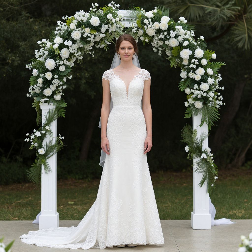 Photograph of a Caucasian woman with fair skin and brown hair, wearing a white, lace, V-neck, sleeveless wedding dress with a lace veil. She stands in front of a white arch adorned with white flowers and green foliage. The background is dark green foliage, creating a contrast with her bright dress. The arch is flanked by tall white pillars, and a small white flower is visible in the foreground. The image has a natural, outdoor setting with soft lighting.
