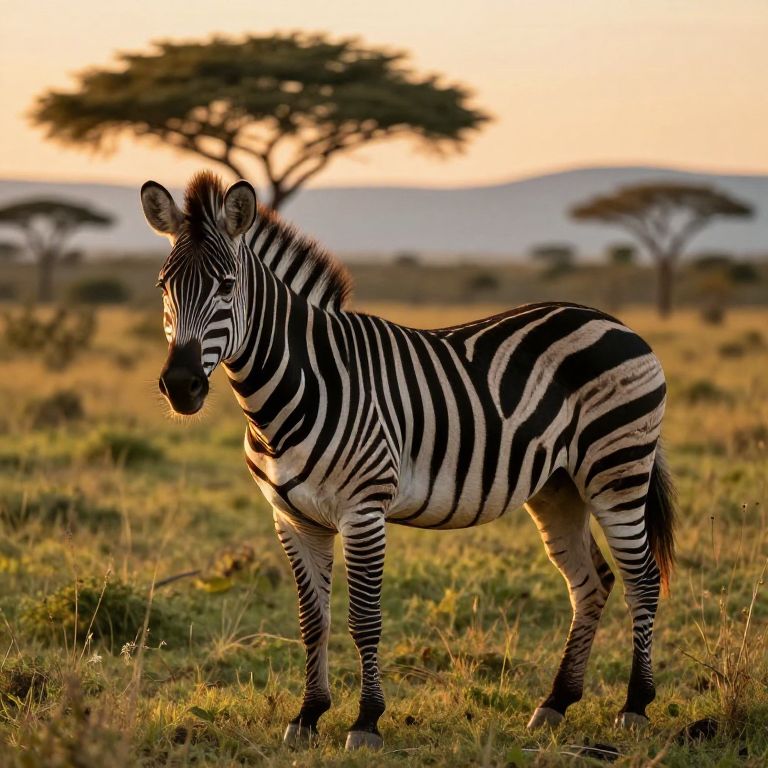 Cebra standing gracefully in a lush savannah at golden hour, vibrant black and white stripes contrasting with warm orange sunlight, detailed texture on fur, soft focus background with acacia trees and distant mountains, highly detailed nature scene.