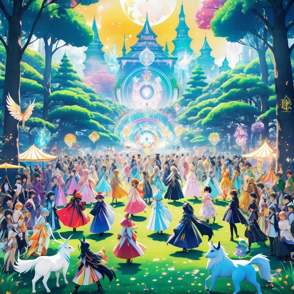 A vibrant anime-style illustration depicting a large gathering of magical creatures and people in colorful attire for a festival. The scene is set in a bright, fantastical forest with lush green trees, mystical glowing symbols in the sky, and various fantastical beings including winged animals and a bright orange horse. The atmosphere is lively and enchanting, capturing the essence of a magical celebration in a fantasy world.