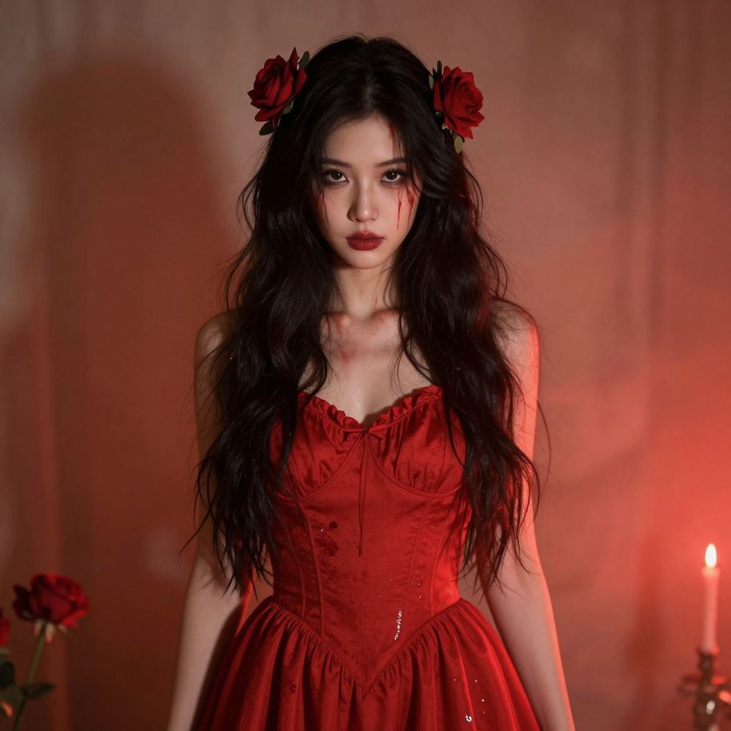 A woman with long, dark hair adorned with red roses, wearing a blood-stained red dress, stands in a macabre, soft-lit atmosphere with a warm, crimson glowing aura.
