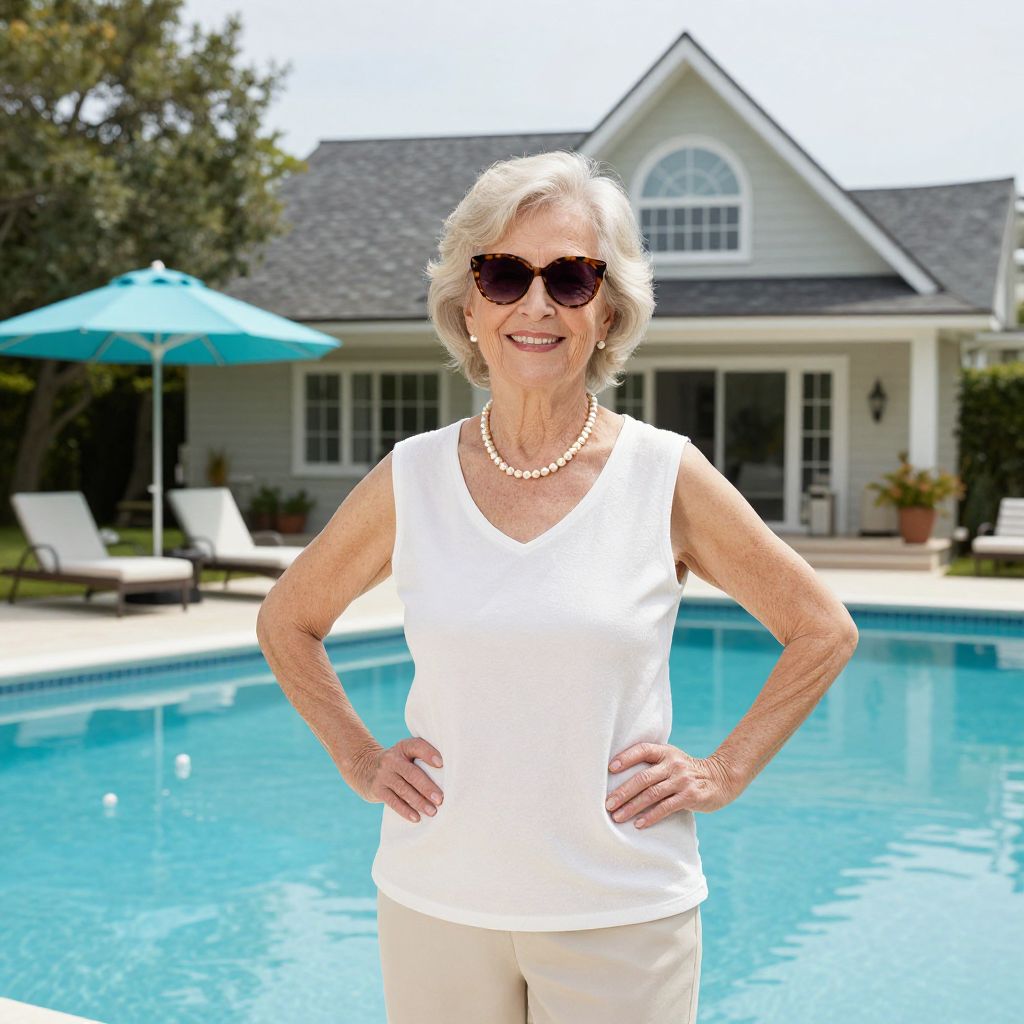 Smiling senior woman wearing tortoiseshell sunglasses and pearls stands confidently by a crystal-clear swimming pool, surrounded by a serene backyard featuring a teal umbrella, lounge chairs, and a well-maintained house with a gabled roof in the background.