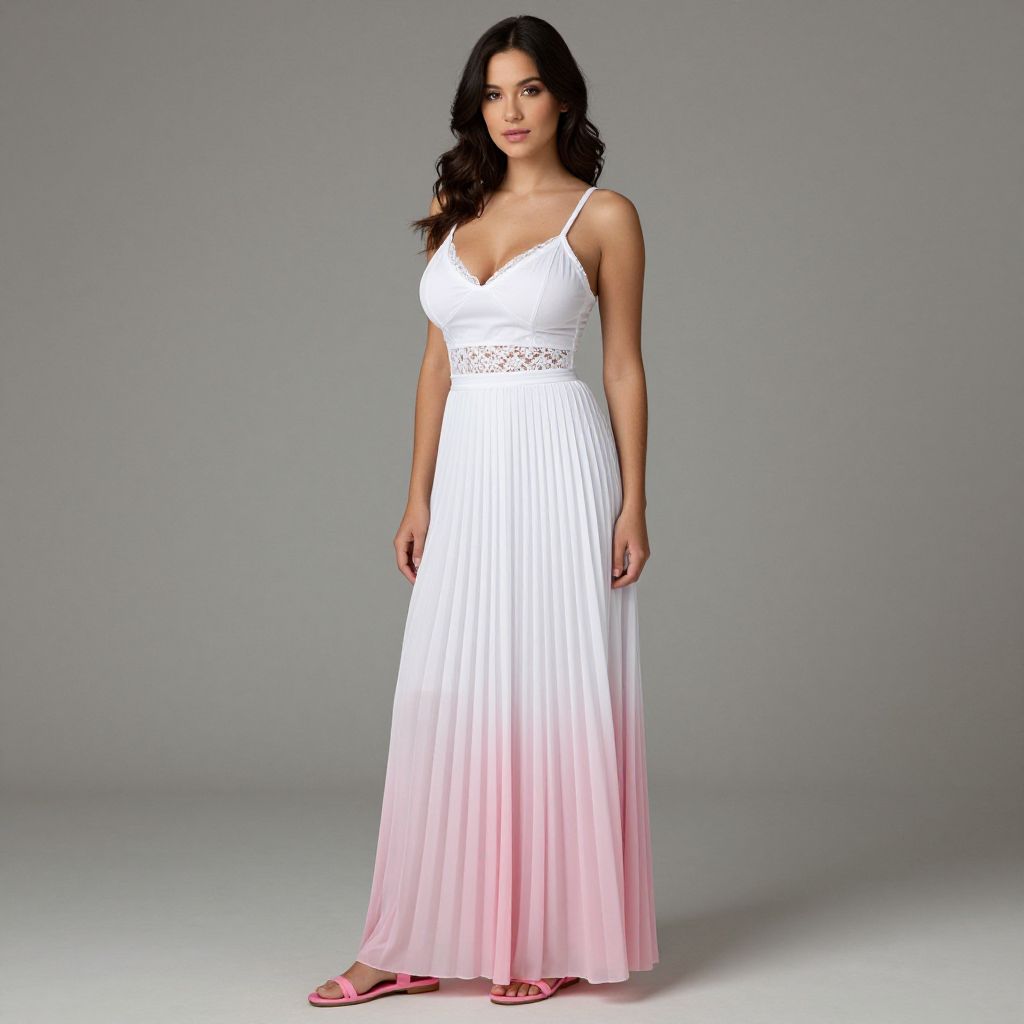 "Woman, girly, white fitted top with spaghetti straps and lace detail at waist, pleated ombre skirt transitioning from white to pink, floor-length, flat pink sandals.. Sexy. Pretty face and beаutiful eyes. Big breasts."