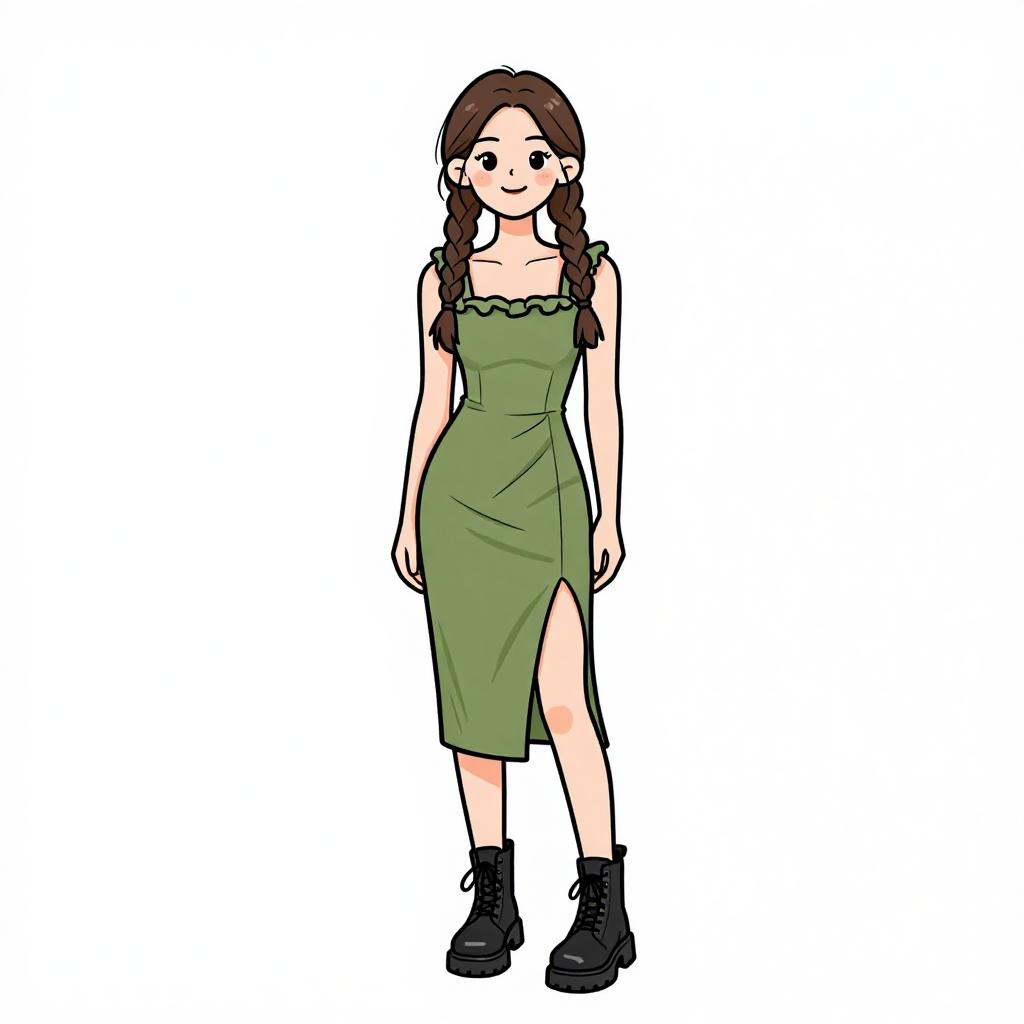 Woman with pretty face and pretty hair. smiling Woman, casual contemporary, sleeveless midi sundress in vibrant lime green, thin pink shoulder straps, fitted bodice with shirred waistline, flared skirt, black chunky lace-up boots, minimalist jewelry, white studio background. --sref 1467