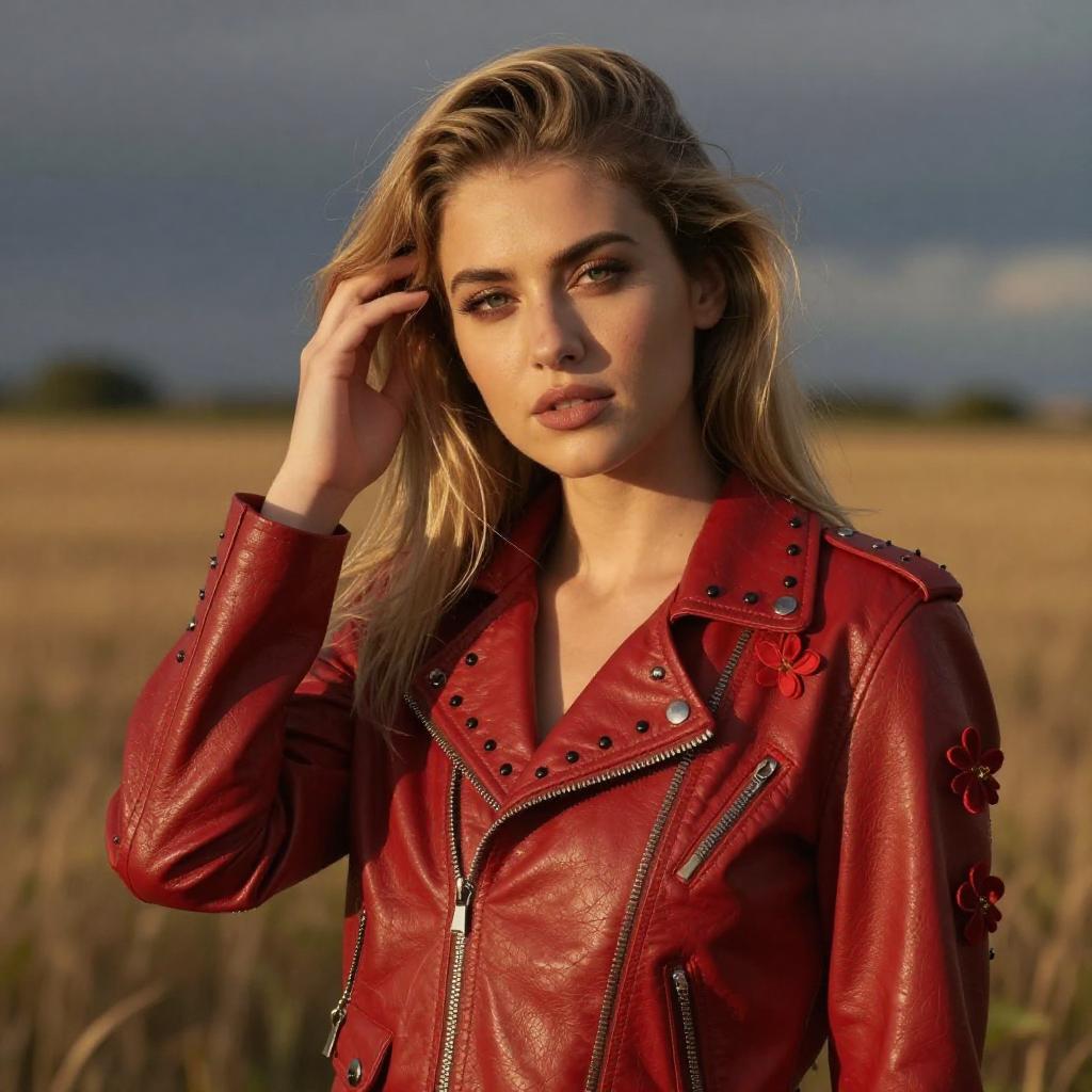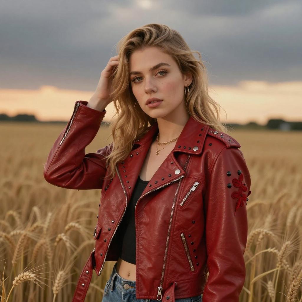 Photograph of a blonde woman with wavy hair, wearing a black leather jacket and skirt, kneeling on grass beside a weathered wooden box. She rests her chin on her hand, looking thoughtfully into the distance. Sunlight filters through trees in the background, casting dappled shadows on the ground.