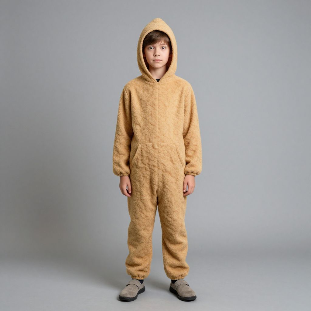 Photograph of a young boy standing against a plain, light gray background. He is wearing a full-body, beige, fuzzy onesie with a hood, reminiscent of a bear suit. The onesie is slightly textured, resembling a plush fabric. He has short brown hair peeking out from under the hood and is looking directly at the camera with a neutral expression. His feet are clad in gray, slip-on shoes. The lighting is even, eliminating any shadows, and the overall composition is simple and centered, highlighting the boy and his outfit.