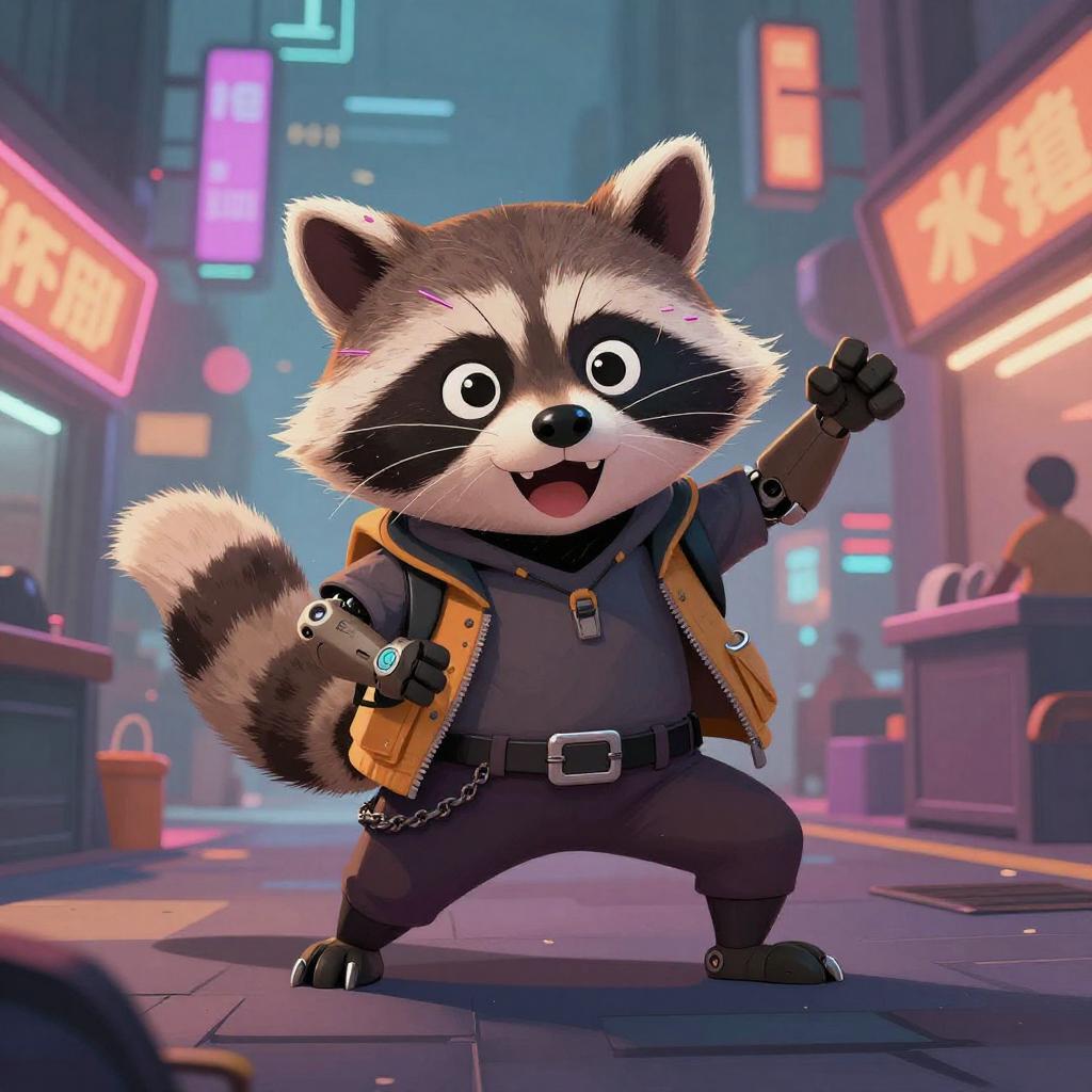Robotic Raccoon Thief in Cyberpunk Marketplace
