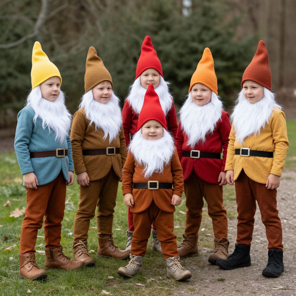 Photograph of five young children dressed as gnomes in colorful hats, brown suits, and white beards, standing outdoors on grass.