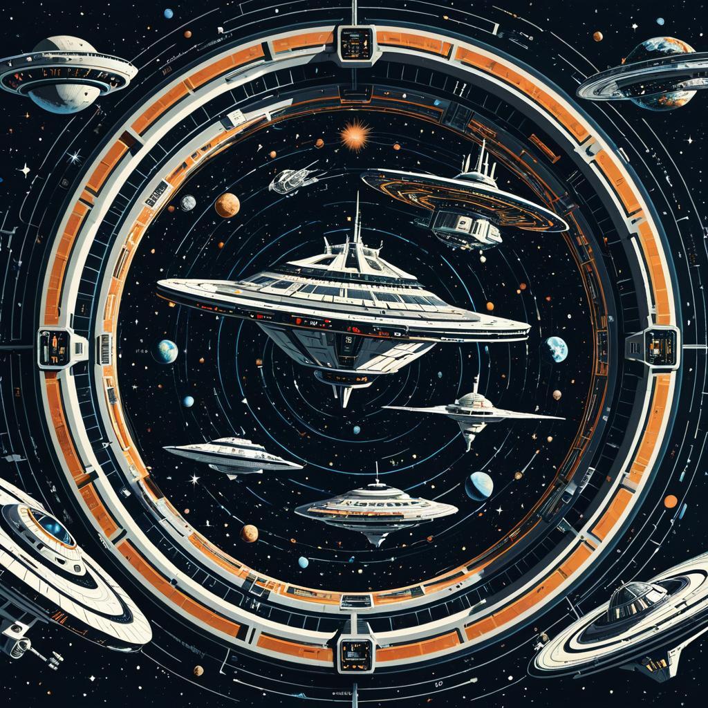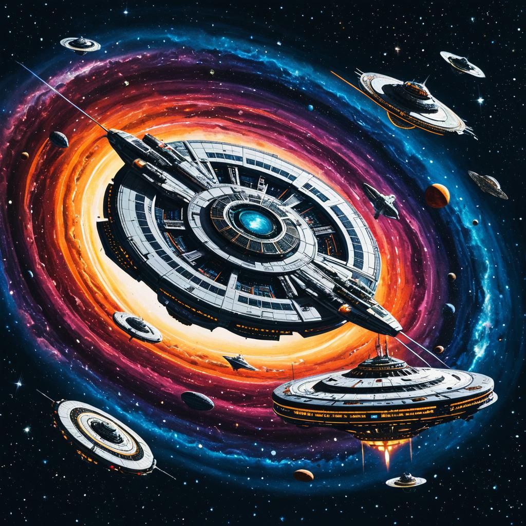 A vibrant cosmic background with a myriad of futuristic spaceships. These ships vary in design, color, and size. Some are sleek and streamlined, while others have intricate patterns and designs. The central focus is a large, circular space station with a unique, infinity-like shape. vintage sci-fi layered hulls, cosmic dawn aurora remnants