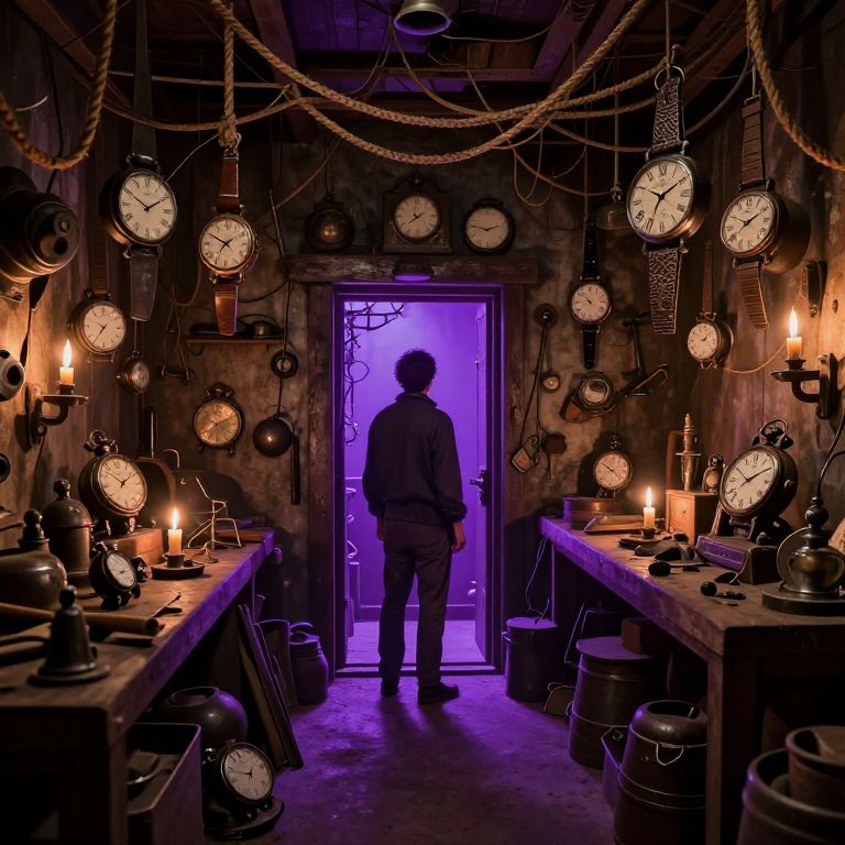 In a dimly lit, claustrophobic old tinker's workshop, a solitary figure stands in the center, gazing into a mysterious, purple-lit doorway. The room is cluttered with an array of old watches and metal artifacts, their surfaces weathered and worn. Ropes and cables hang from the ceiling, creating a web of intricate lines that add to the sense of disarray. The walls are adorned with various tools and equipment, their shapes and textures contributing to the workshop's aged and utilitarian atmosphere. The room is illuminated by candles, casting a warm, flickering light that contrasts with the cool, purple glow emanating from the doorway. The overall composition is dense and layered, with objects and elements arranged in a way that creates a sense of depth and complexity. The spatial relationships between the various objects and the figure suggest a narrative of exploration and discovery, as if the tinker is on the verge of uncovering something significant beyond the doorway. The scene is rich in detail, from the precise placement of each artifact to the interplay of light and shadow, creating a vivid and immersive visual experience.