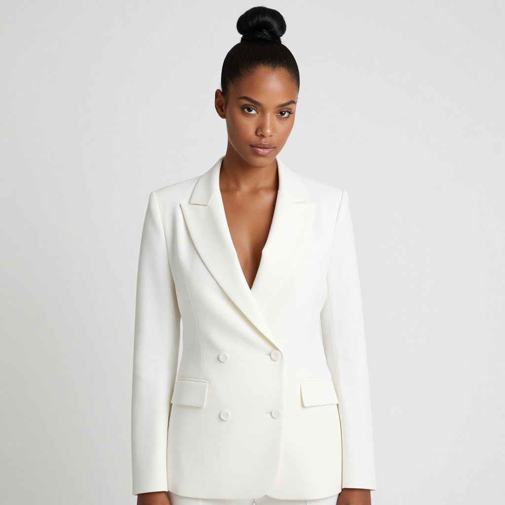 Photograph of a tall, dark-skinned woman with a sleek, high bun hairstyle. She's wearing a chic, white, wrap-style blazer that's slightly open at the chest, revealing a hint of cleavage. She stands with a confident, slightly angled pose against a stark white background, which makes her and her outfit stand out sharply. The overall style is modern and minimalistic.