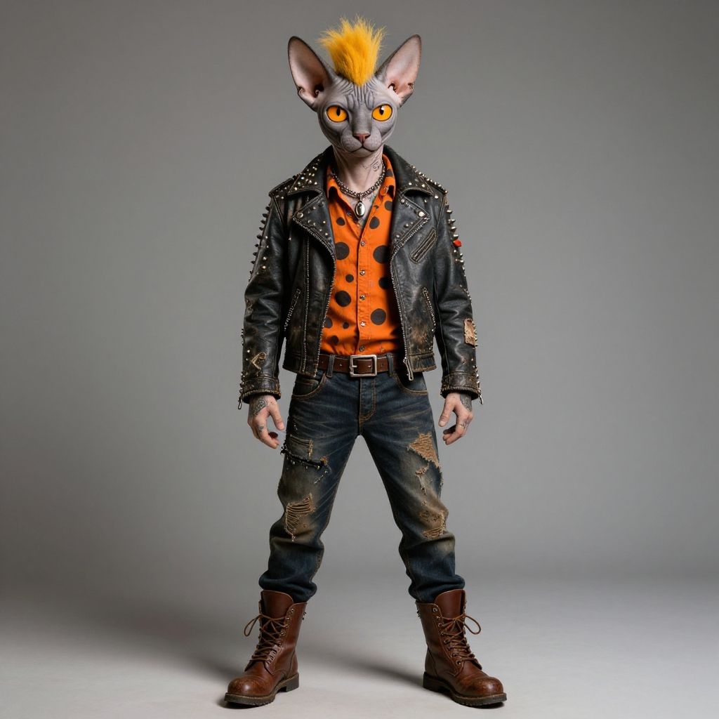 ((not a human)), style exudes a punk rock vibe, suggesting a feline rocker persona, (((full body photo))), wears a studded leather jacket that appears worn and rugged, Beneath the jacket, its body is adorned with tattoos, Lace-up boots, loosely tied, waxed destressed blue jeans, ((rustic colors)), super realistic bipedal Masterpiece, Best Quality, a blend of human and animal traits, The characterтАЩs head is a hyena mix with a Sphynx cat, with no fur, large orange hue eyes, and yellow tufts of hair on top, with grey fur, small orange hue eyes, eye-catching, vintage dark orange shirts with (large black spots) pattern, Neck Accessory, ((Posture full body)), Legs, Leather boots), dark blue jeans, (((Full body in picture))), front view, open wide hand, full style, ((full body in photo))