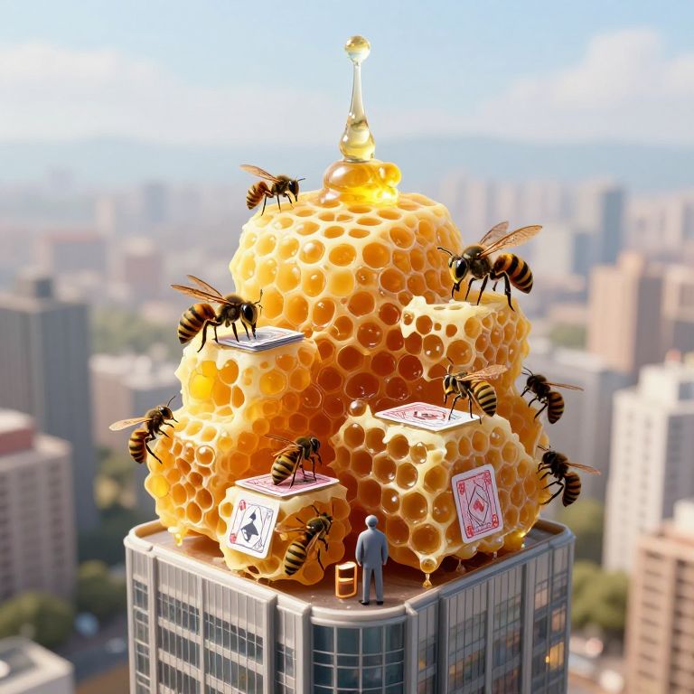 A honeycomb skyscraper pulses with golden nectar, housing both humans and gentle talking wasps who gamble in rooftop card parlors built from wax.