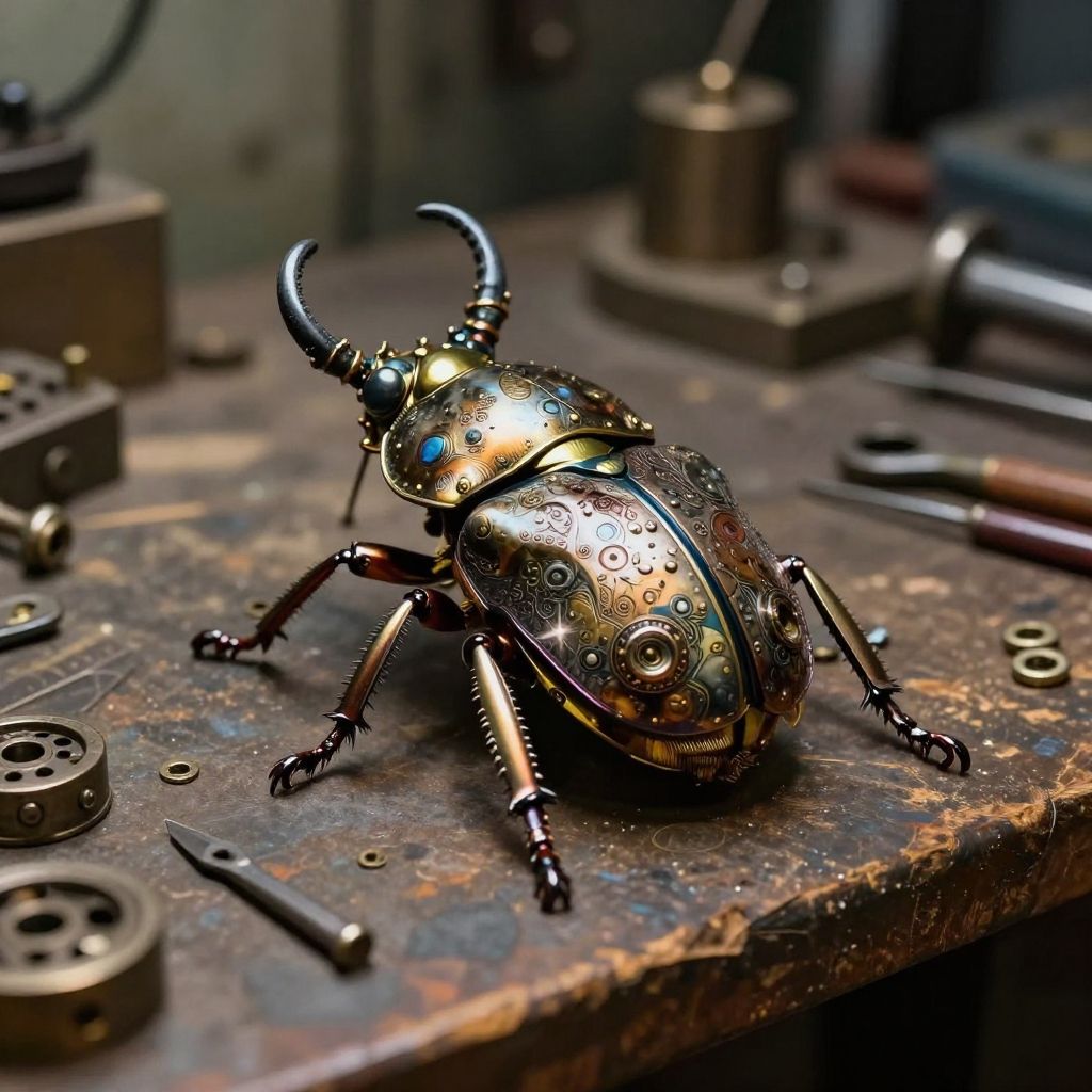 Steampunk Clockwork Hercules Beetle, sitting on a table in an old workshop surrounded by Small tools and spare parts, (More Details:2), (photorealistic:1.5), (intricate and beautiful:1.5), (highres:1.5), (sharp:1.5)