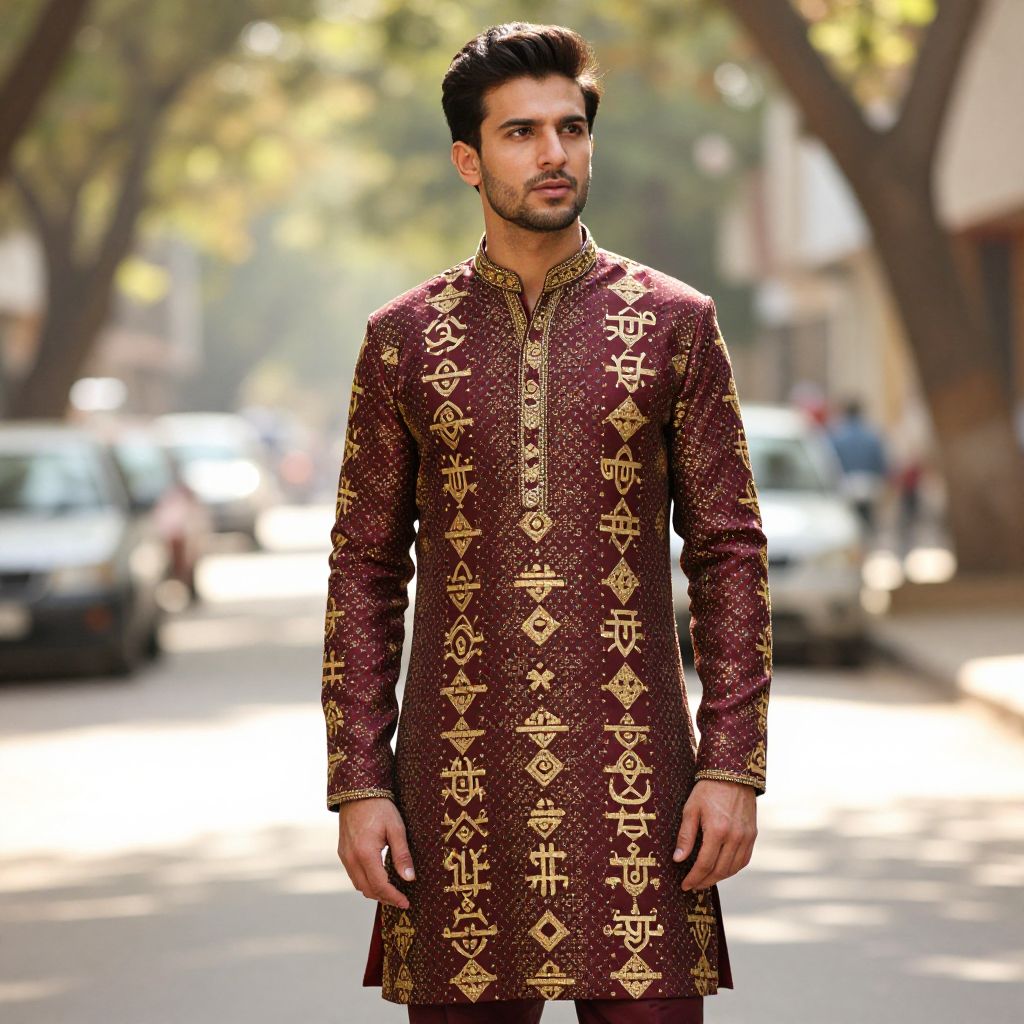 Portrait of a ginger Middle Eastern man with a well-groomed beard, intense green eyes, dressed in modern fusion clothing blending cultural motifs, urban cityscape behind, cinematic lighting