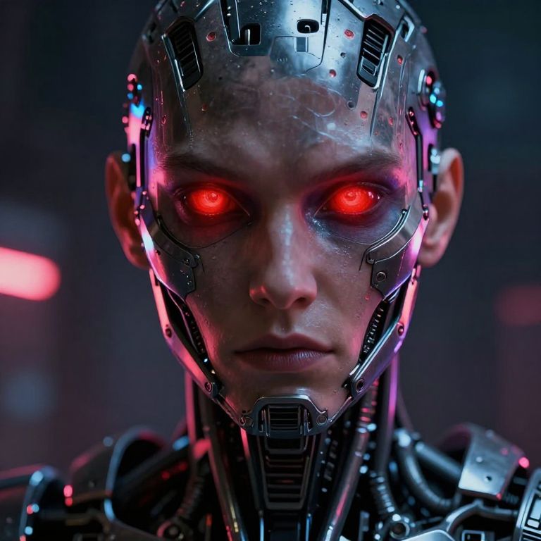 Photorealistic CGI of a cybernetic human with glowing red eyes, metallic headgear, and intricate mechanical features, set against a dark, neon