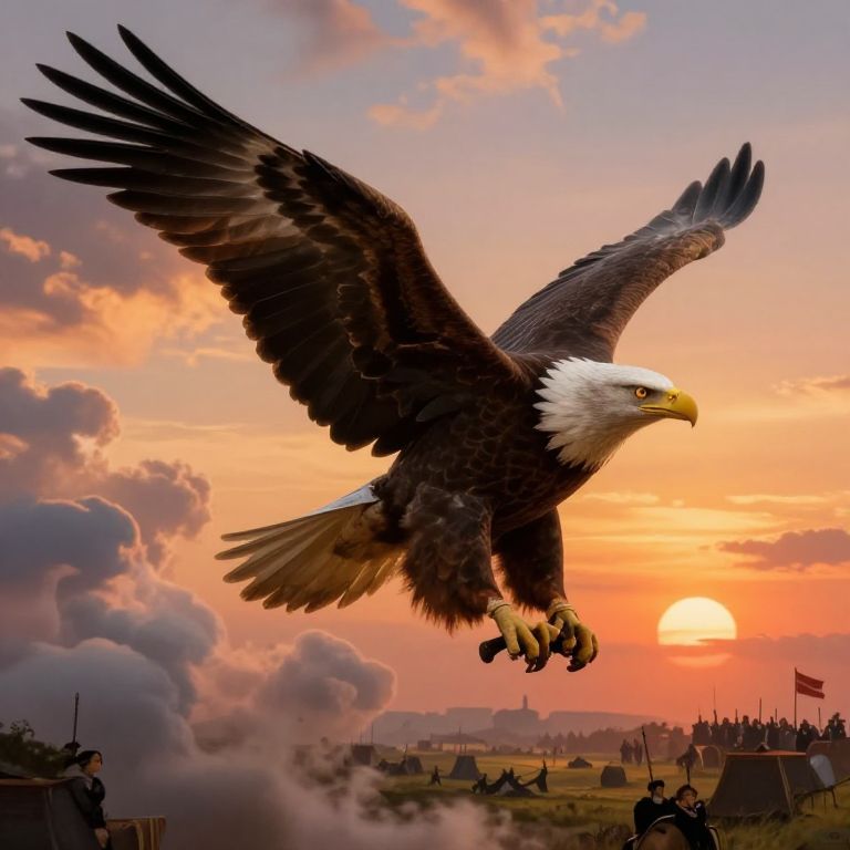 Photograph of a majestic bald eagle mid-flight against a vibrant sunset sky. The eagle's dark brown feathers contrast with its white head and yellow beak, with powerful talons extended. Below, a battlefield scene includes silhouetted soldiers and cannons, with smoke rising and a flag waving in the background. The sun, low on the horizon, casts warm orange and pink hues across the sky, adding dramatic lighting to the eagle's wings and the battlefield. Clouds are scattered, enhancing the dynamic and historical atmosphere of the image.