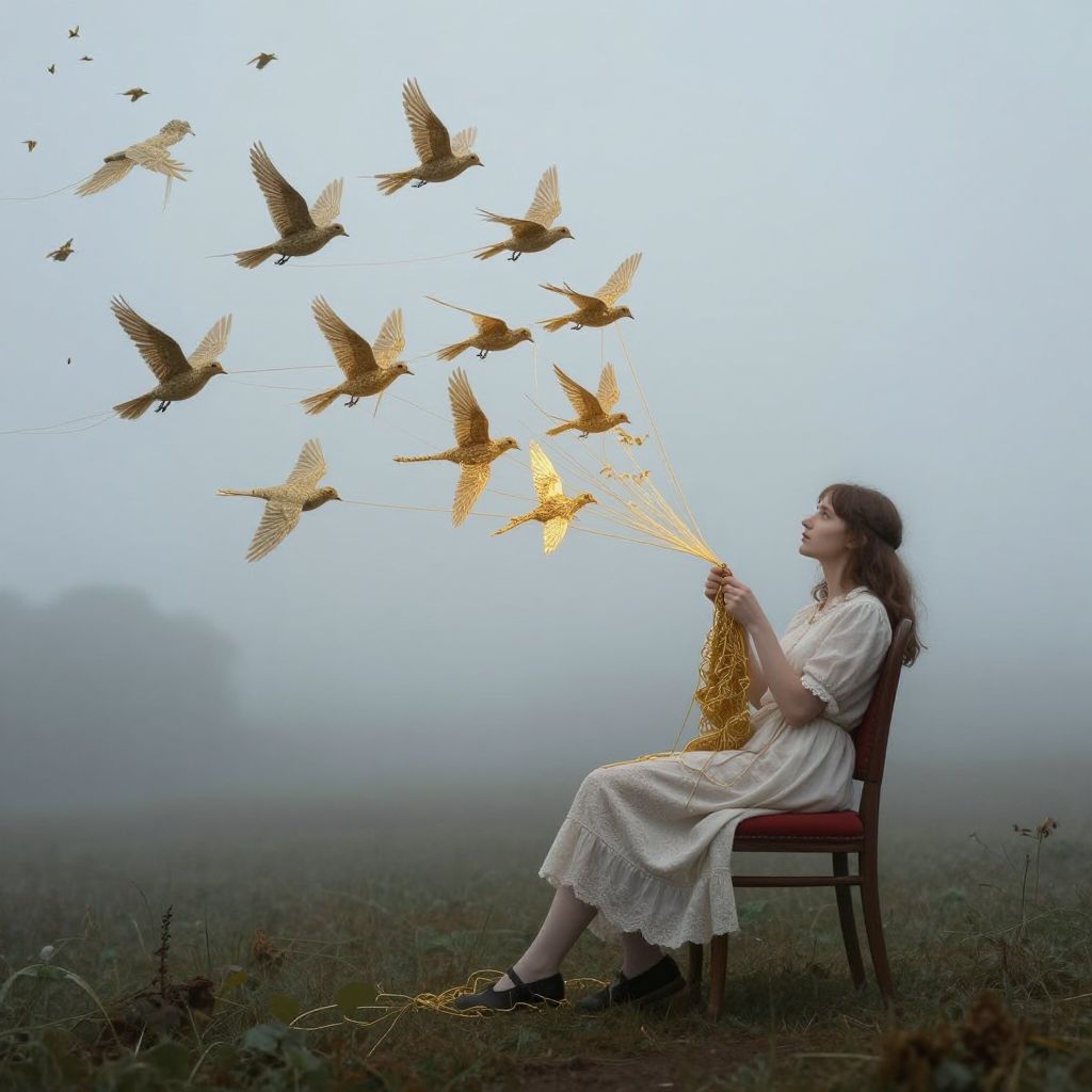 Woman seated on a red-backed wooden chair knits golden threads that transform into a flock of flying birds, which scatter and then reassemble into intricate patterns, evoking a surreal dance between creation and memory amidst a misty, ethereal landscape.